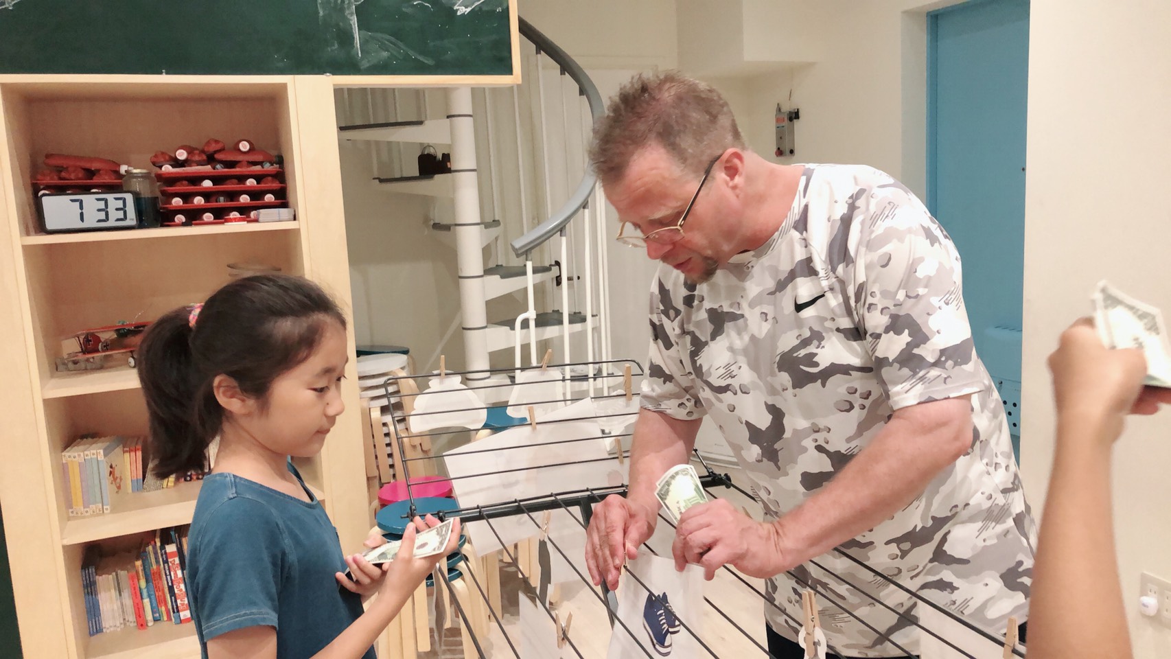 先生:”Let me see. Those shoes are nine dollars. Would you like to buy those?”(そうですね、そちらの靴は9ドルです。お買い上げになりますか?)