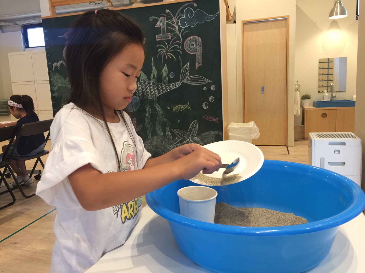 We’ll put some sand on the bottom of the plate later.(お皿の下のほうにあとで砂をつけるよ)