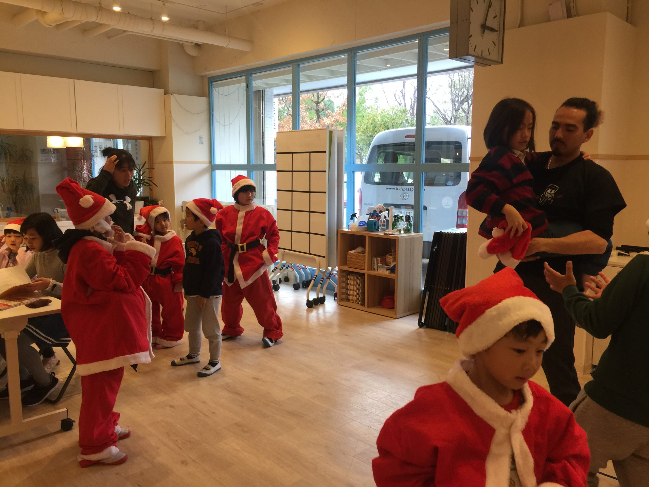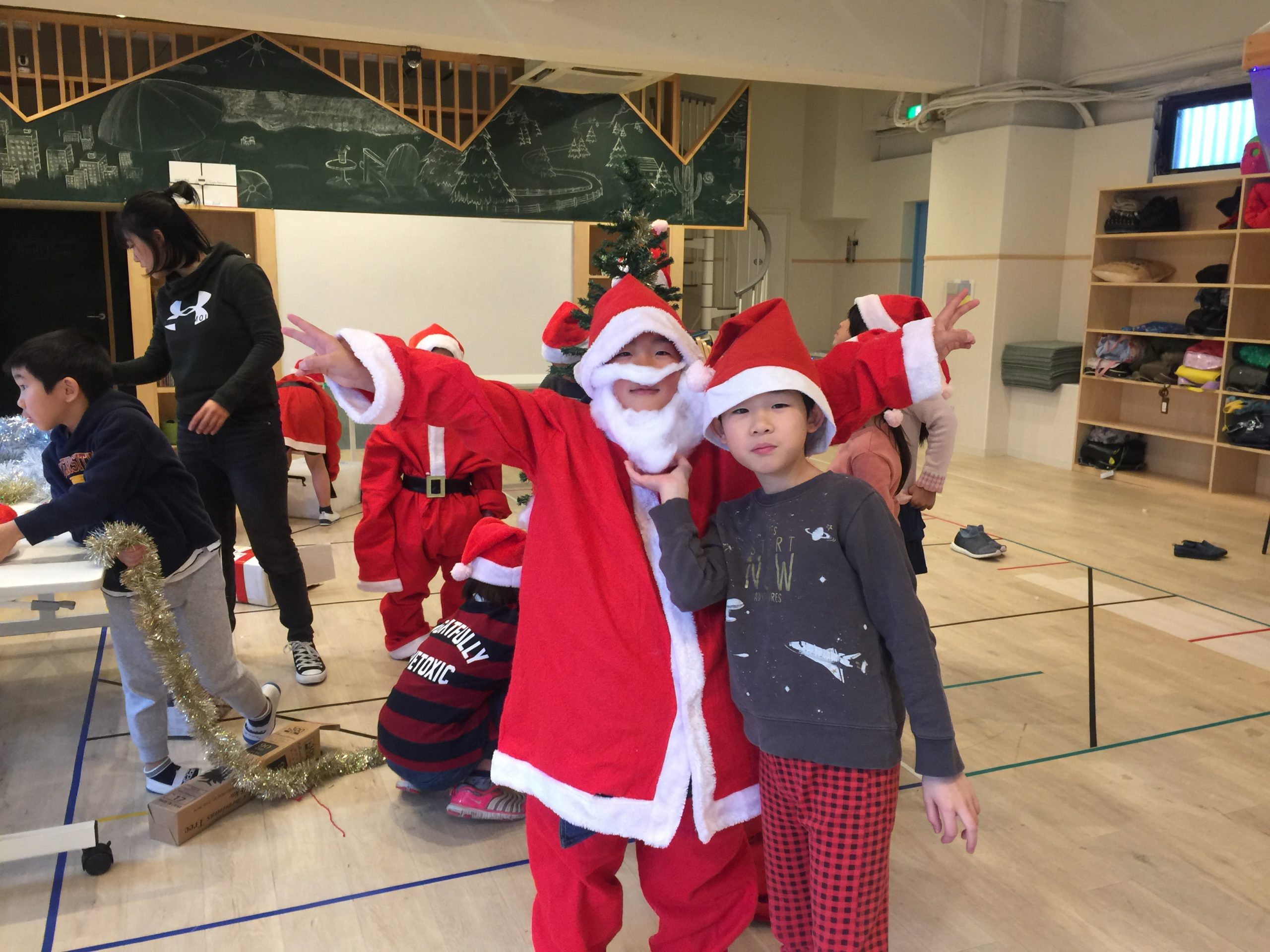 来校した生徒さんの何人かは、サンタさんに変装!?して飾り付けのお手伝いをしてくれました!