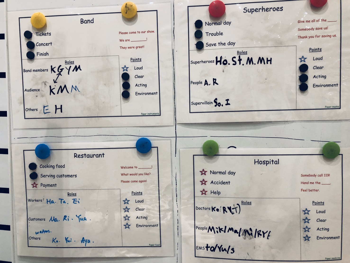 役回りや多少の設定、指定される会話例等をベースにしながら、チームで意見を出し合って考えます。