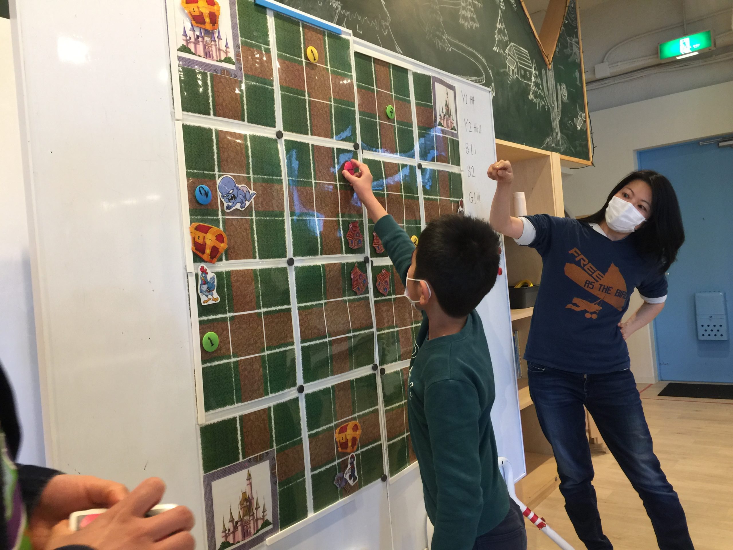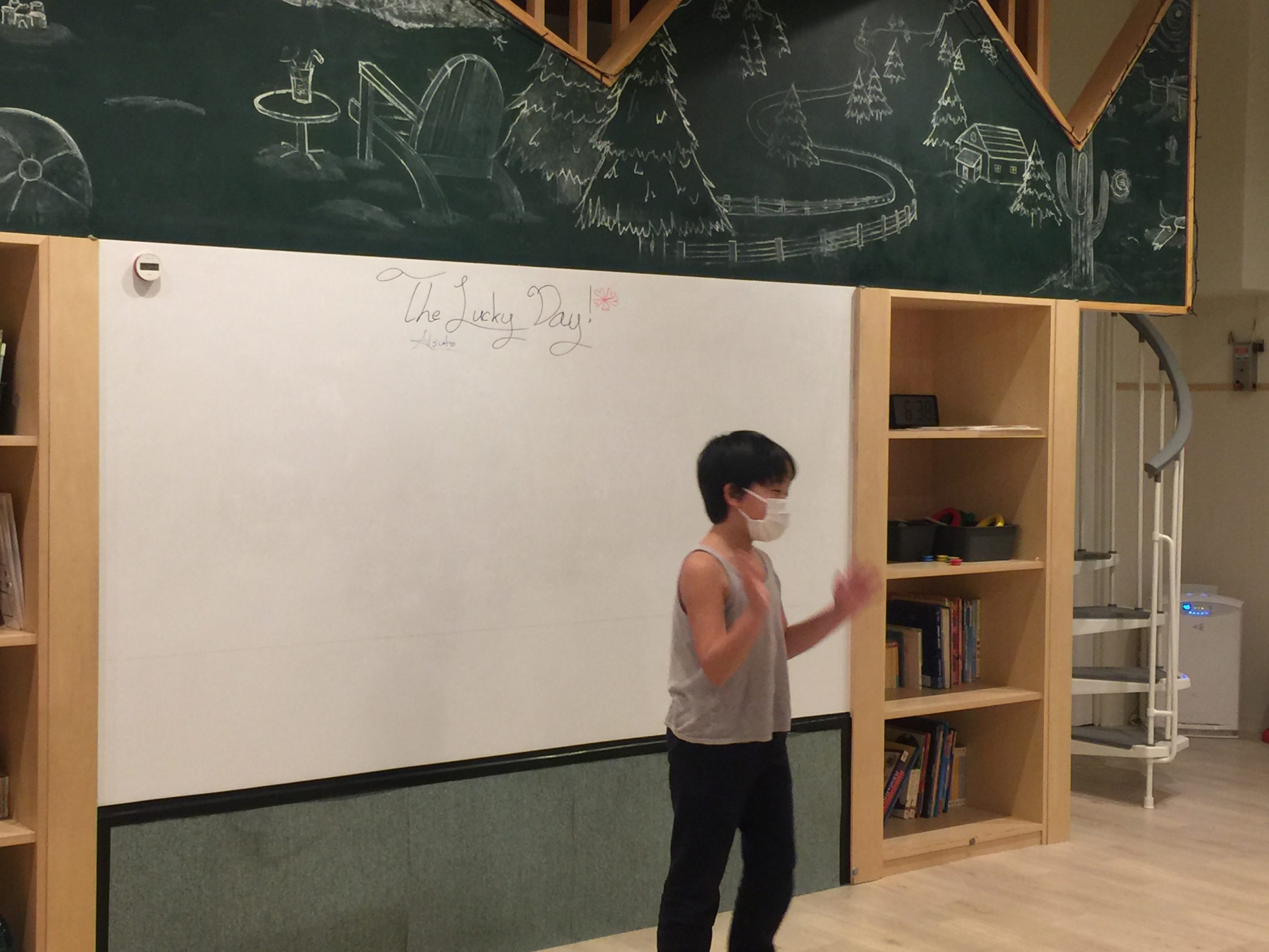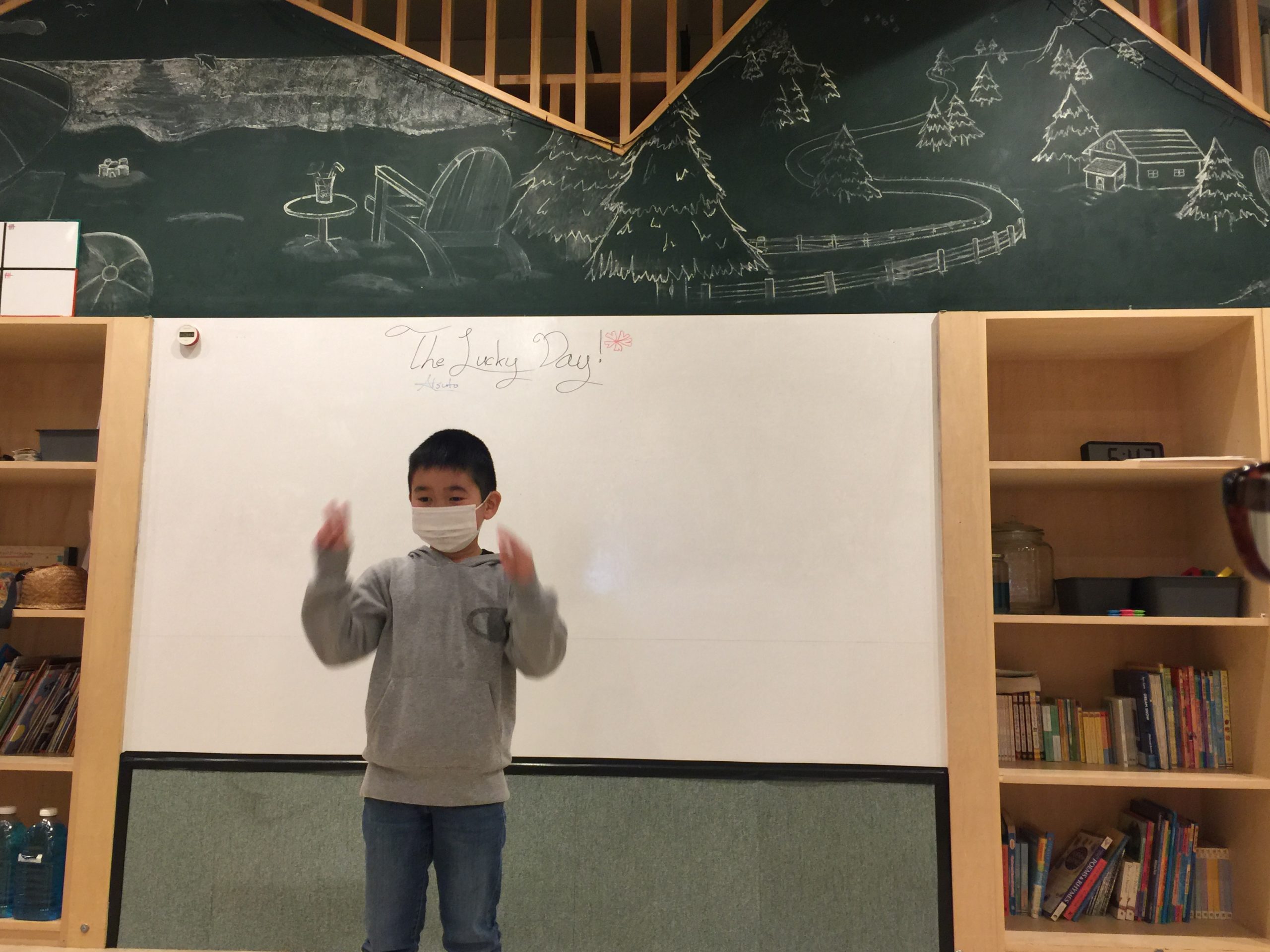 目の前にあるフラッシュカードに書いてある単語を大きな声で言って、前に立っている先生と”Rock-paper-scissors”(ジャンケン)をして勝ったら1歩進む、あいこだったらその場にとどまる、負けたら一歩下がるを繰り返して「どのチームが先にゴールできるかな?」のゲームをしています。