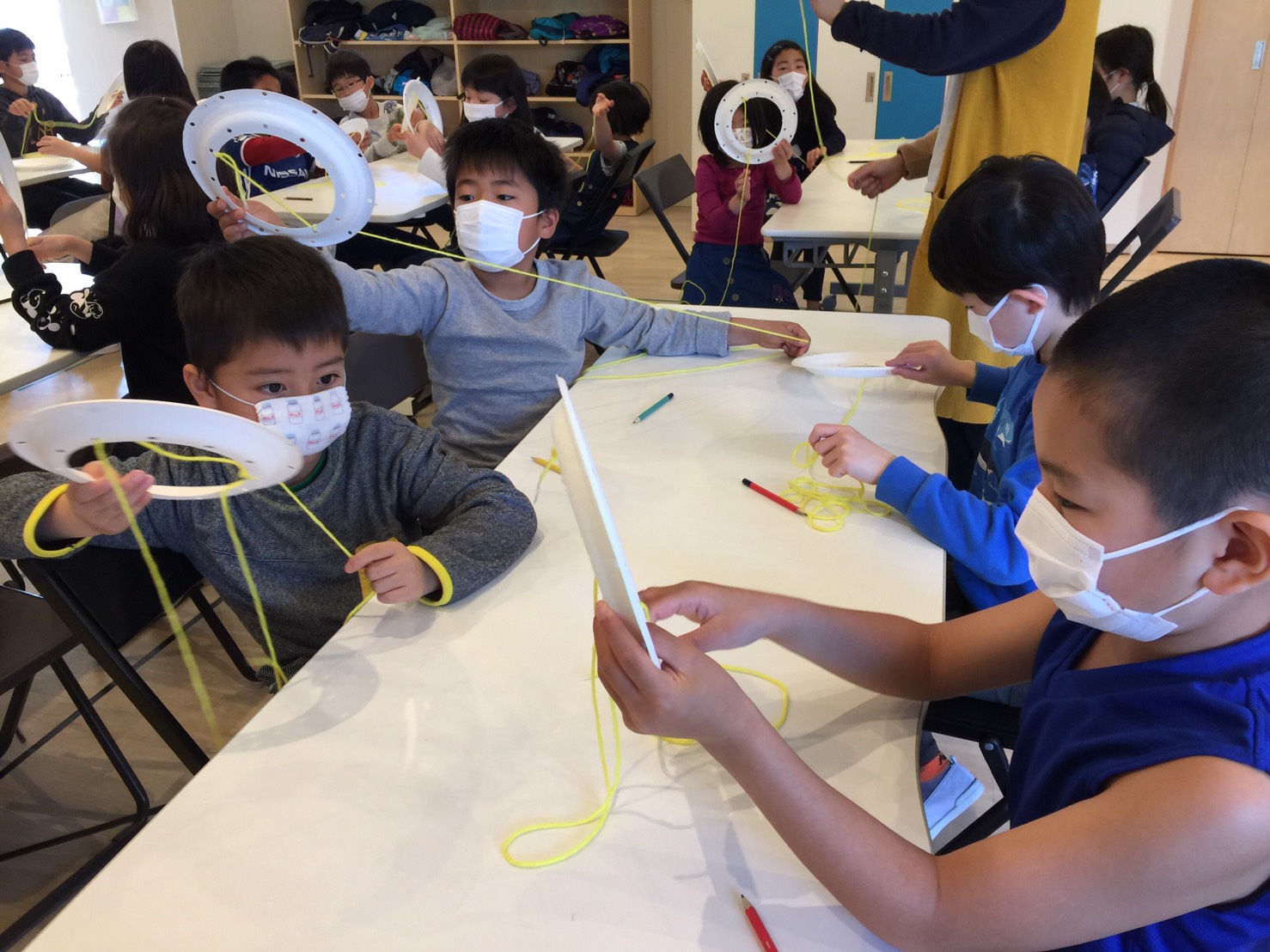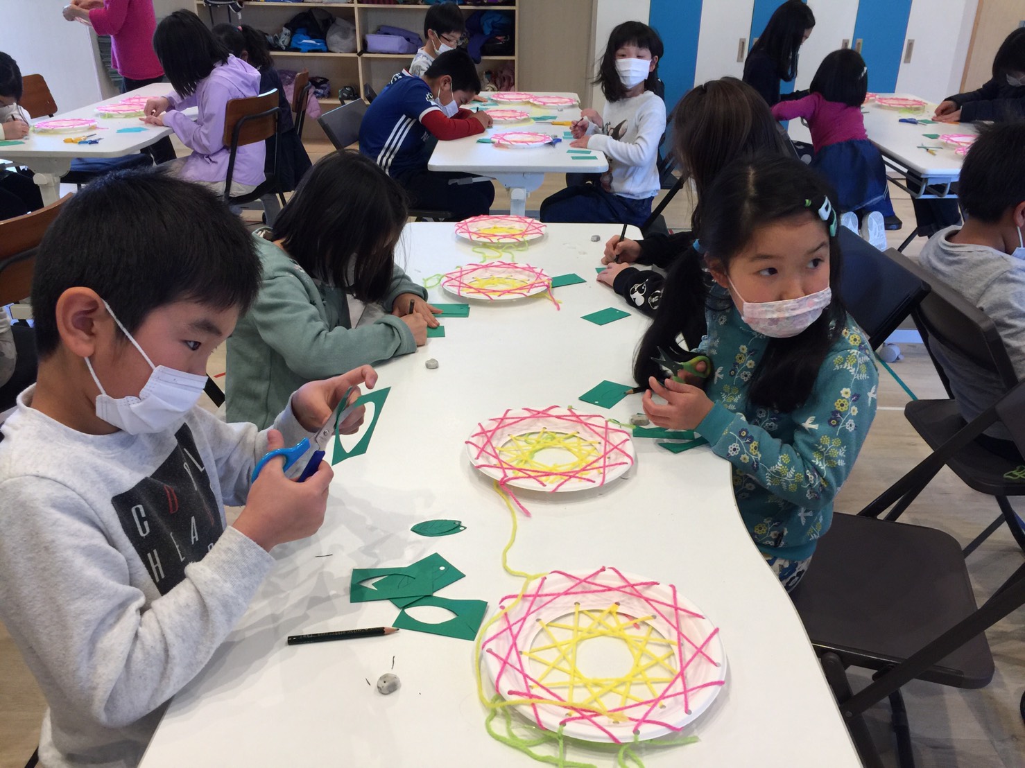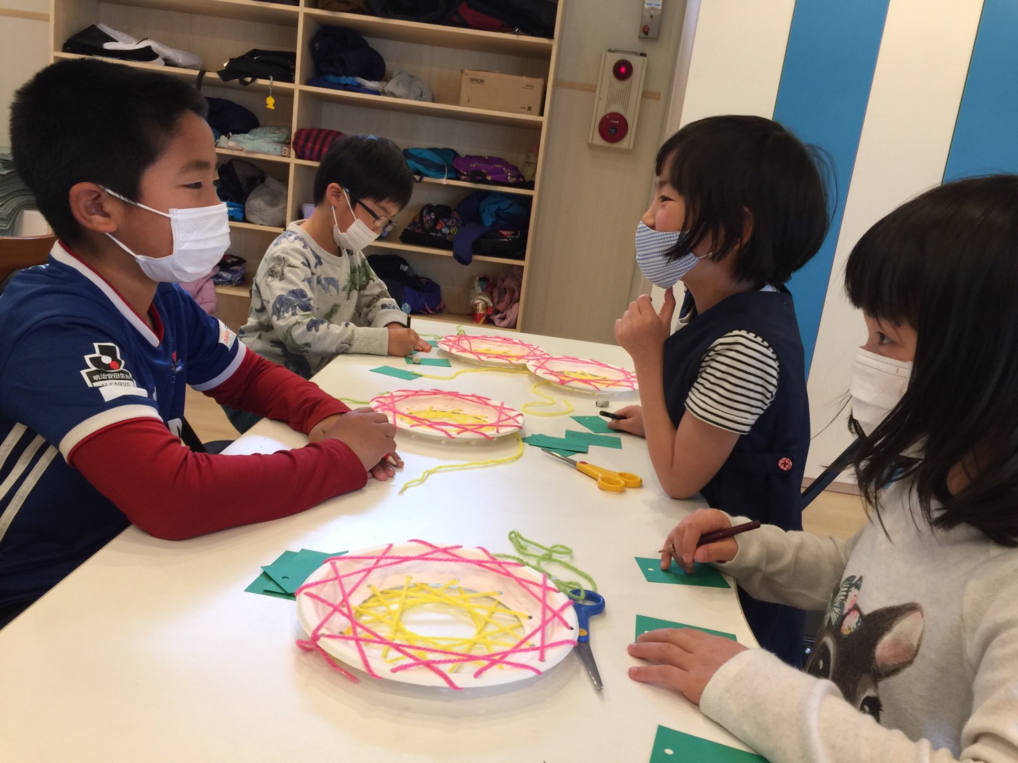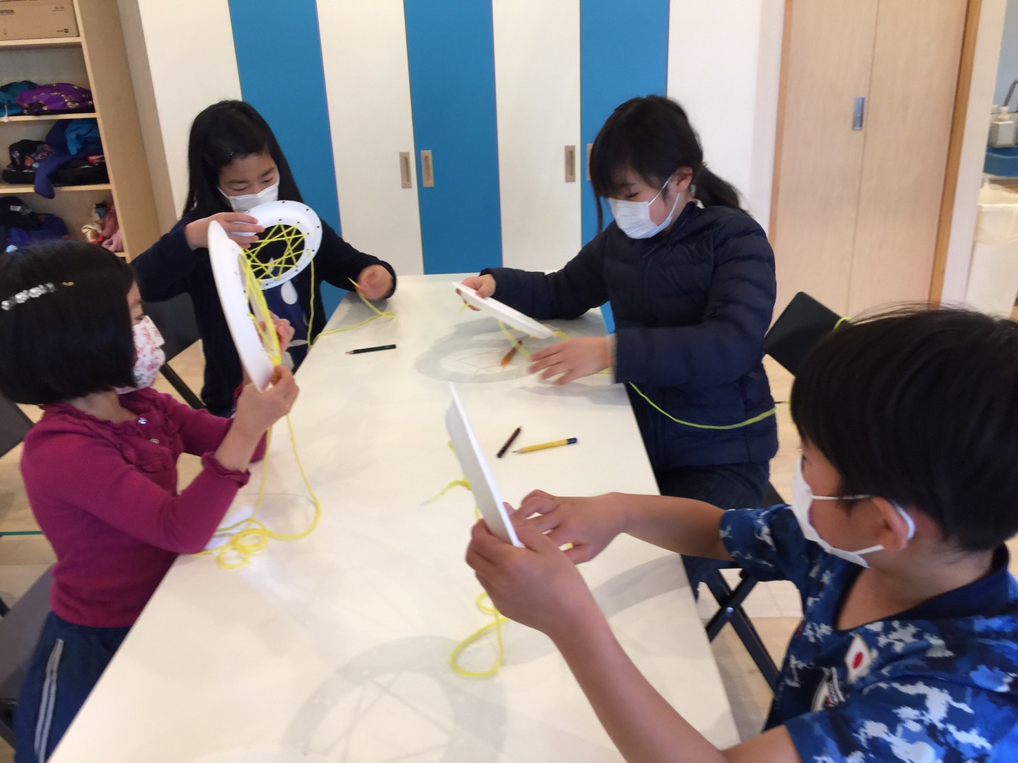 材料の単語を使いながら、お互いに声をかけ合ってカラフルなドリームキャッチャーを作りました。