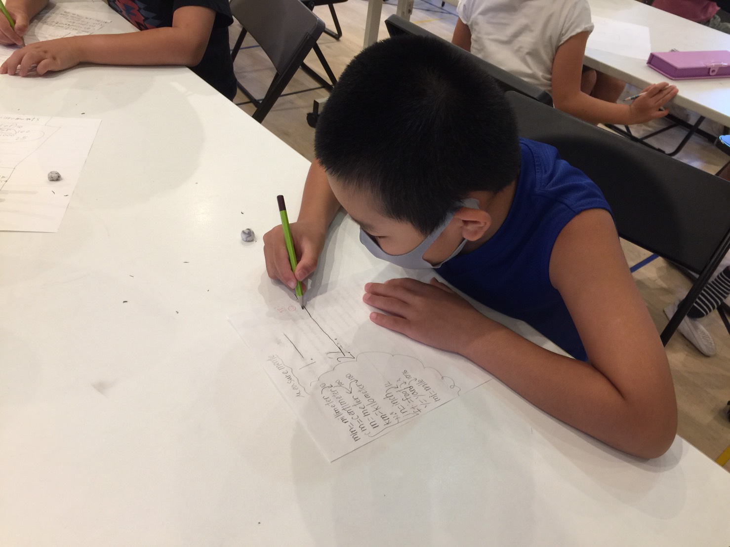 先生たちがキーワードに下線をひいた用紙を作ってくれているのを見ながら、センテンスを全部言えない/覚えられない生徒たちはキーワードを練習しています。