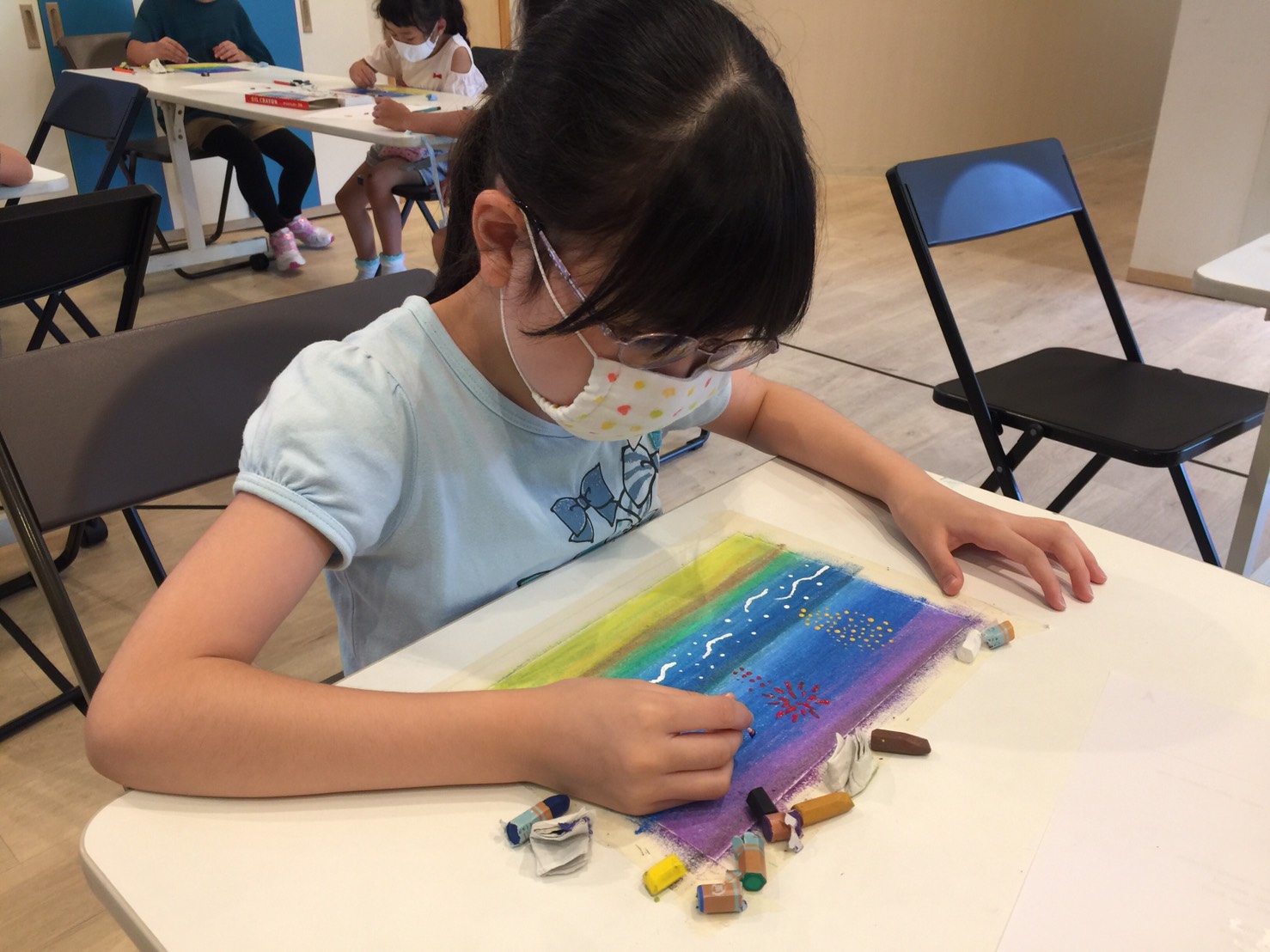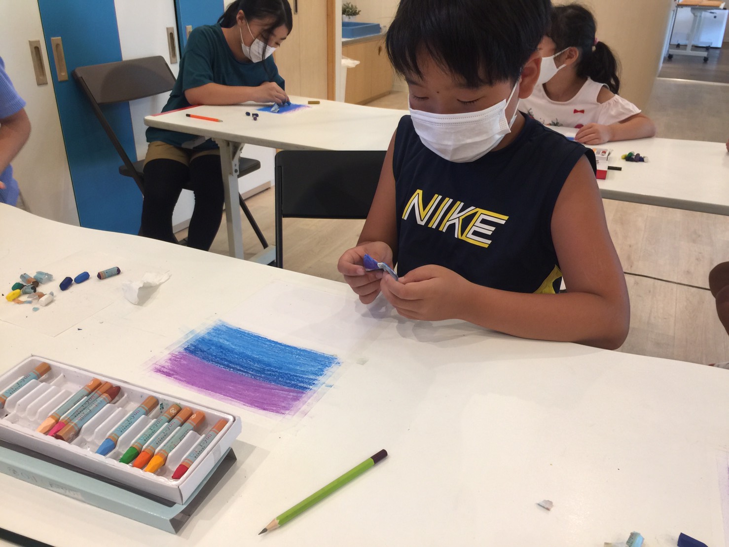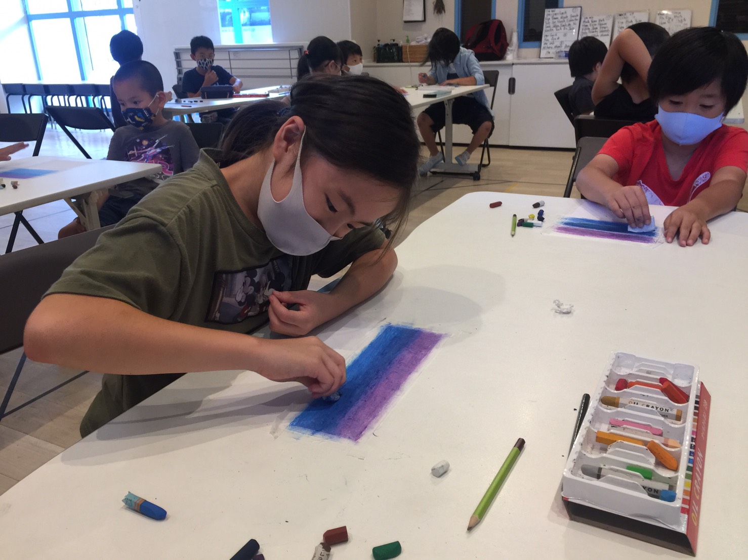 先生のお手本を見ながら順番に色を重ねてこすって・・・を繰り返すとキレイなグラデーションカラーの景色ができました。