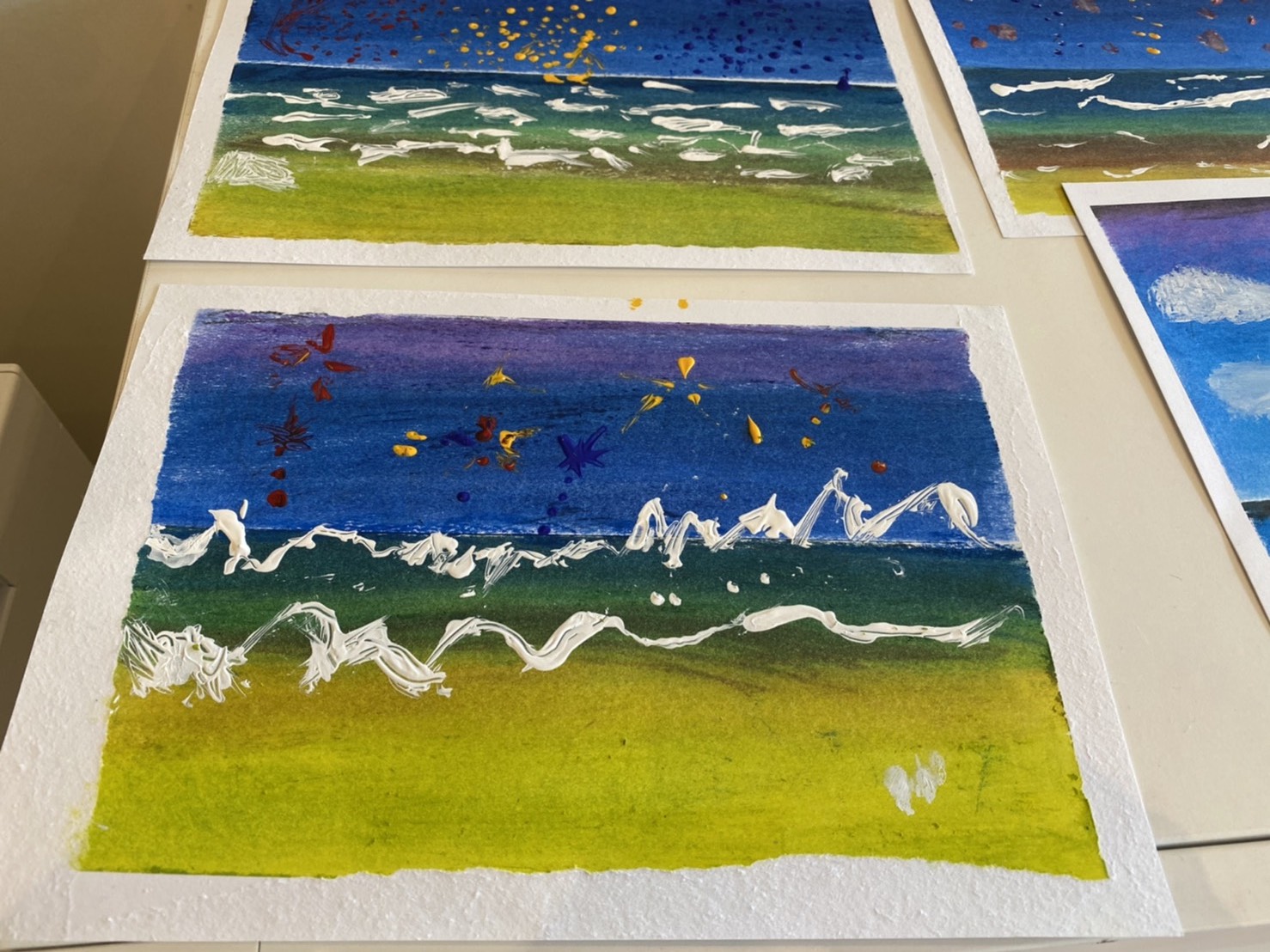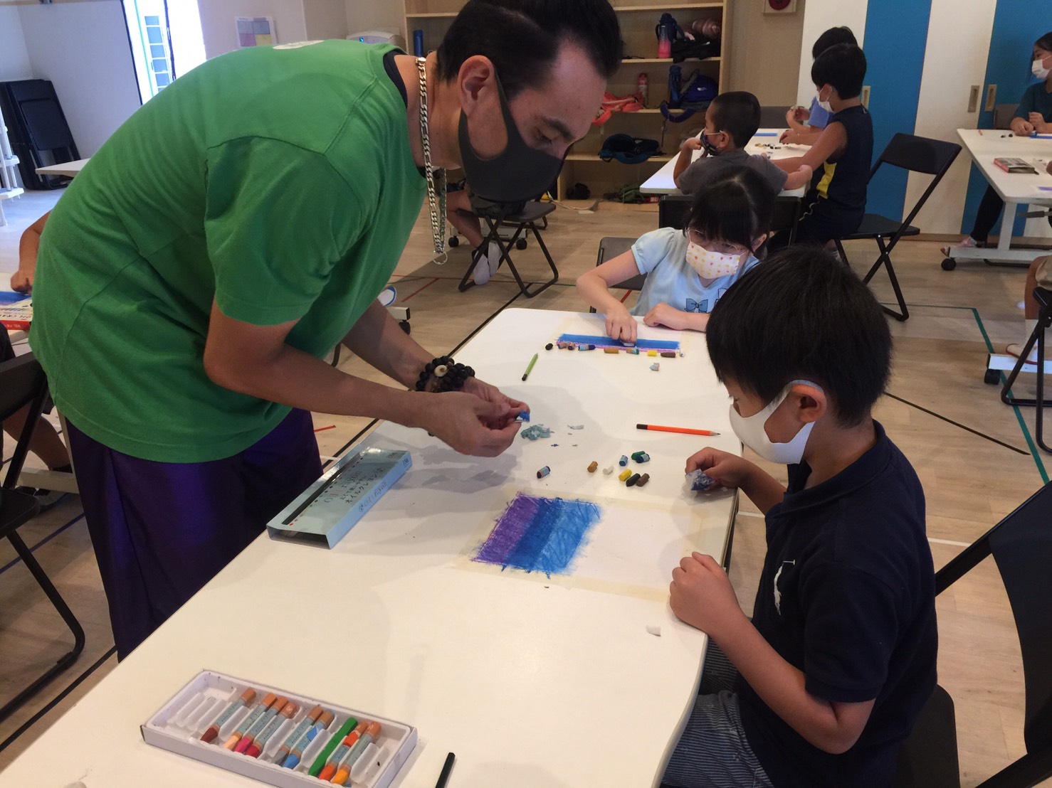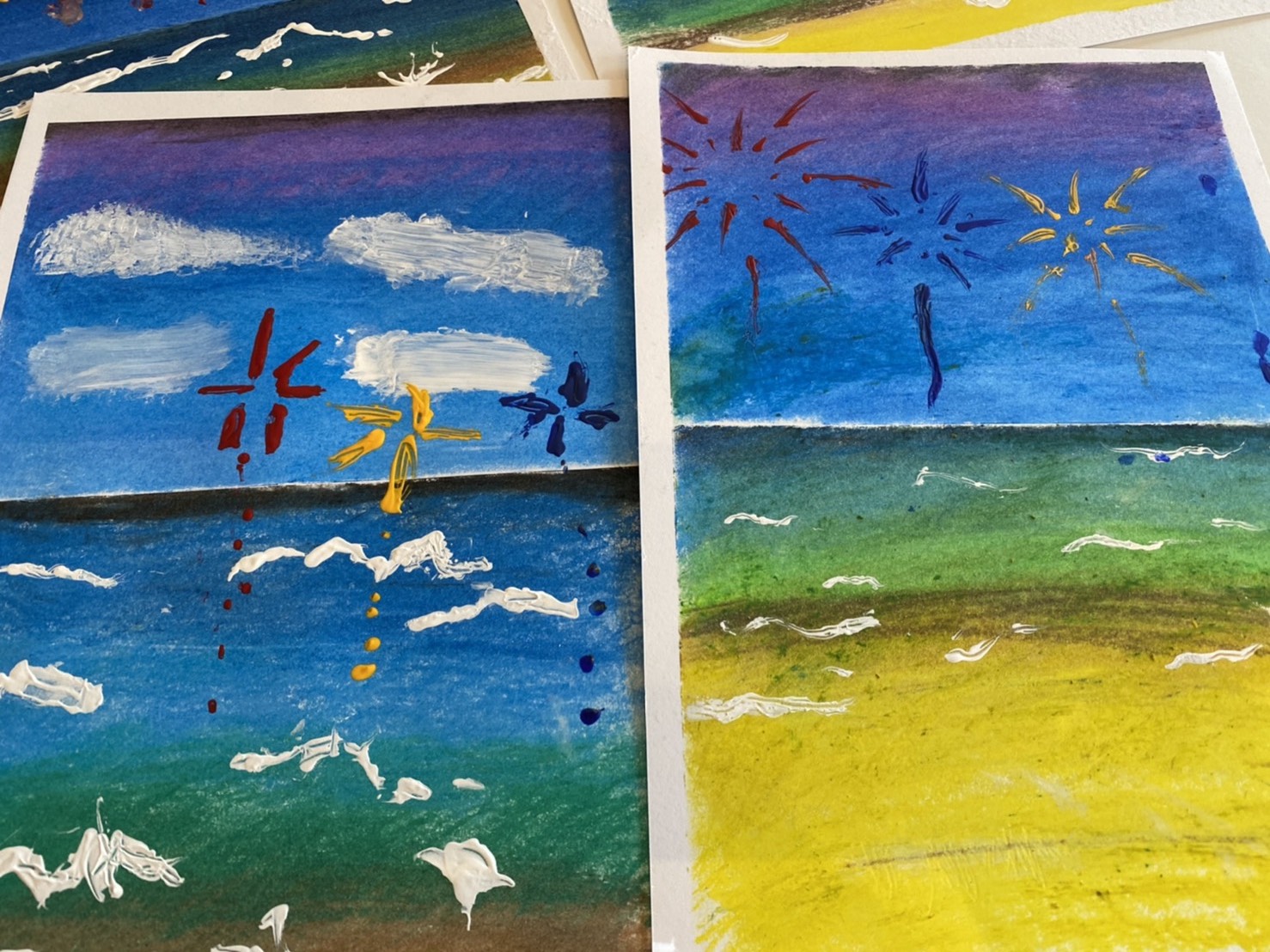 先生のお手本を見ながら順番に色を重ねてこすって・・・を繰り返すとキレイなグラデーションカラーの景色ができました。