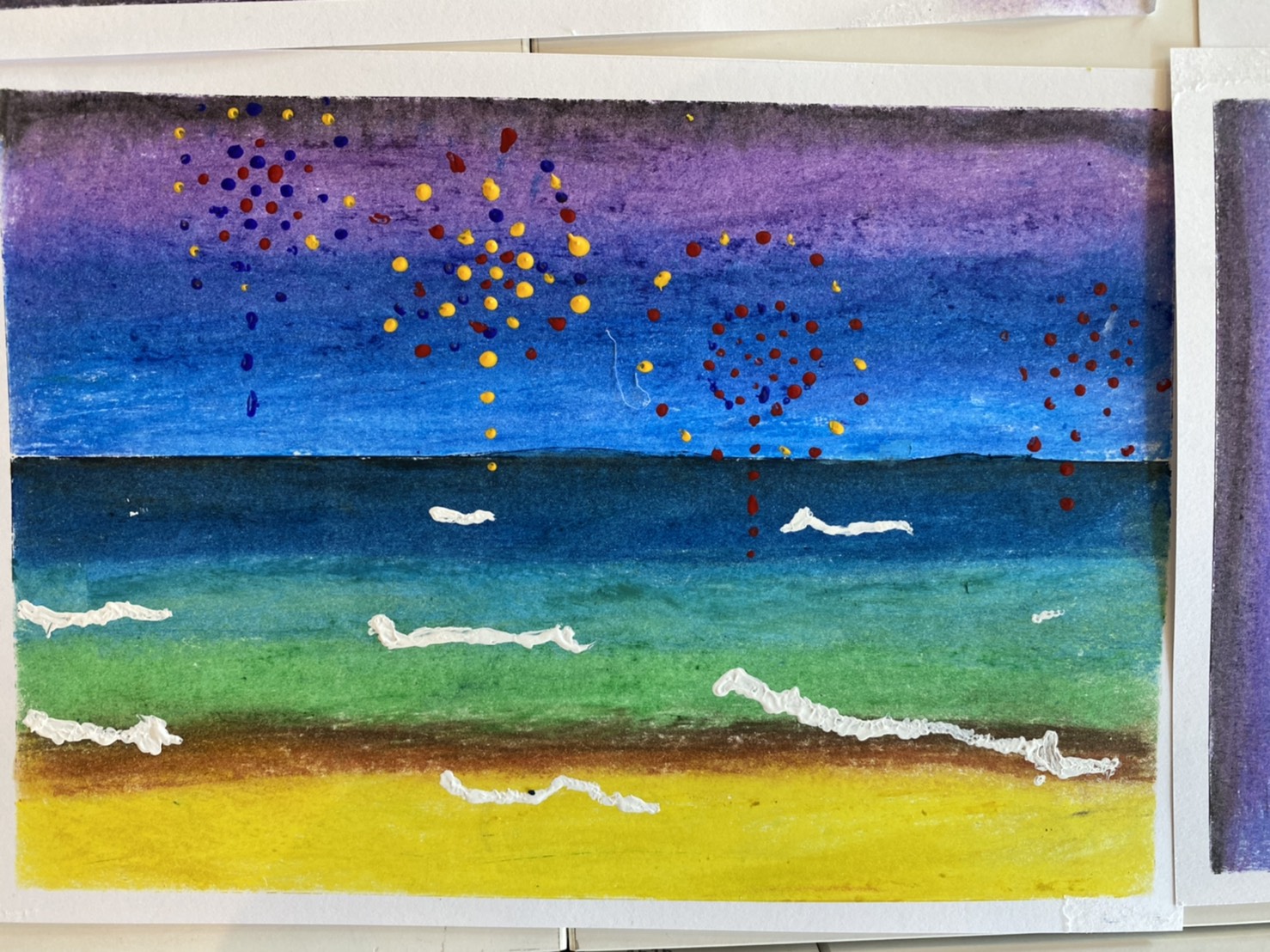 上から絵の具をのせて花火を描いたら完成!