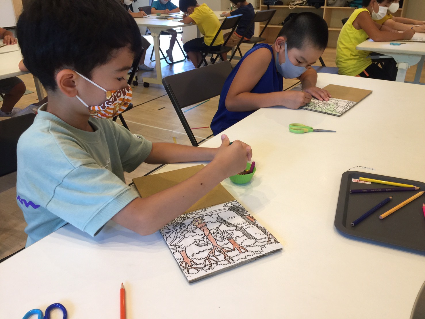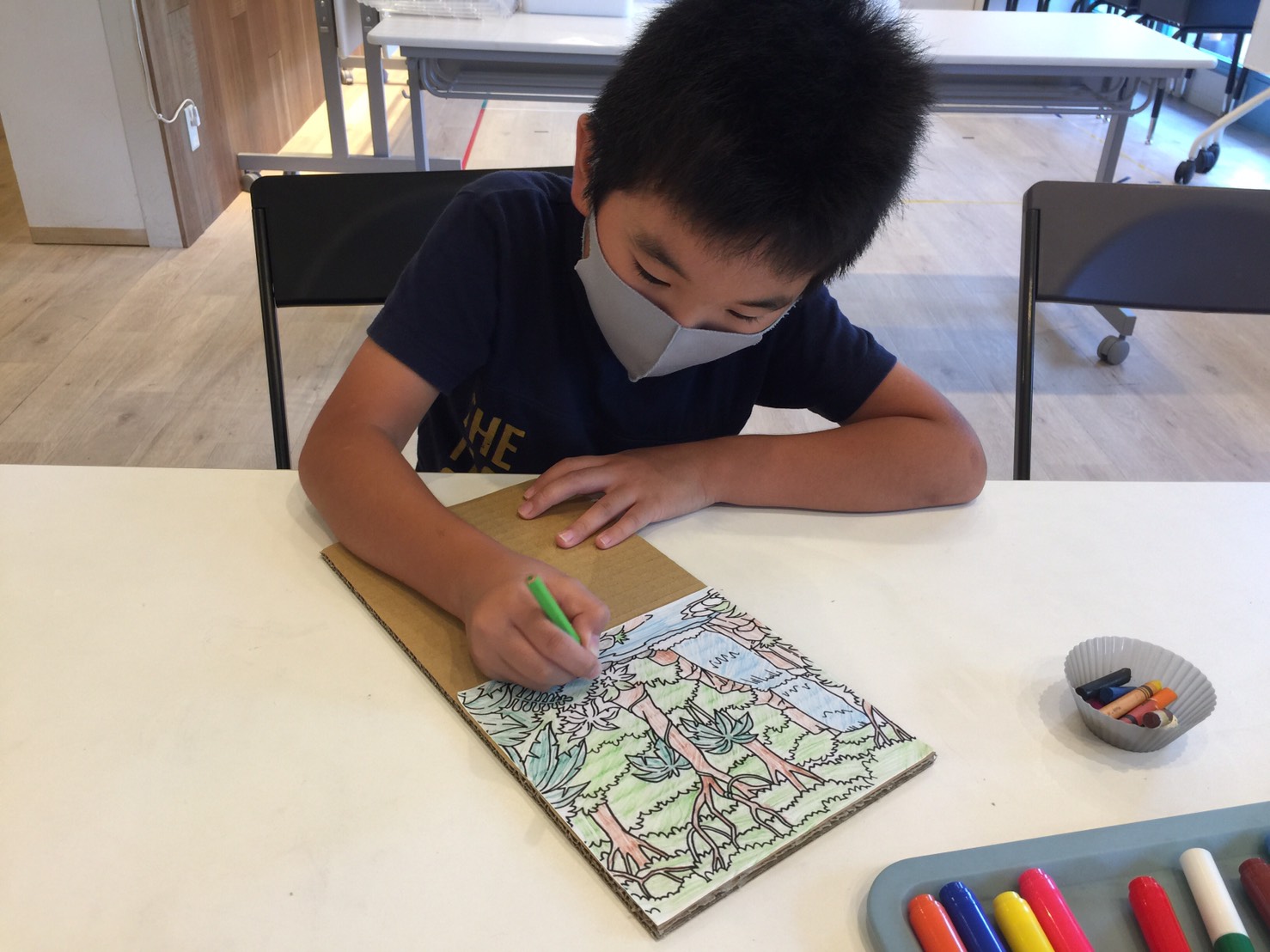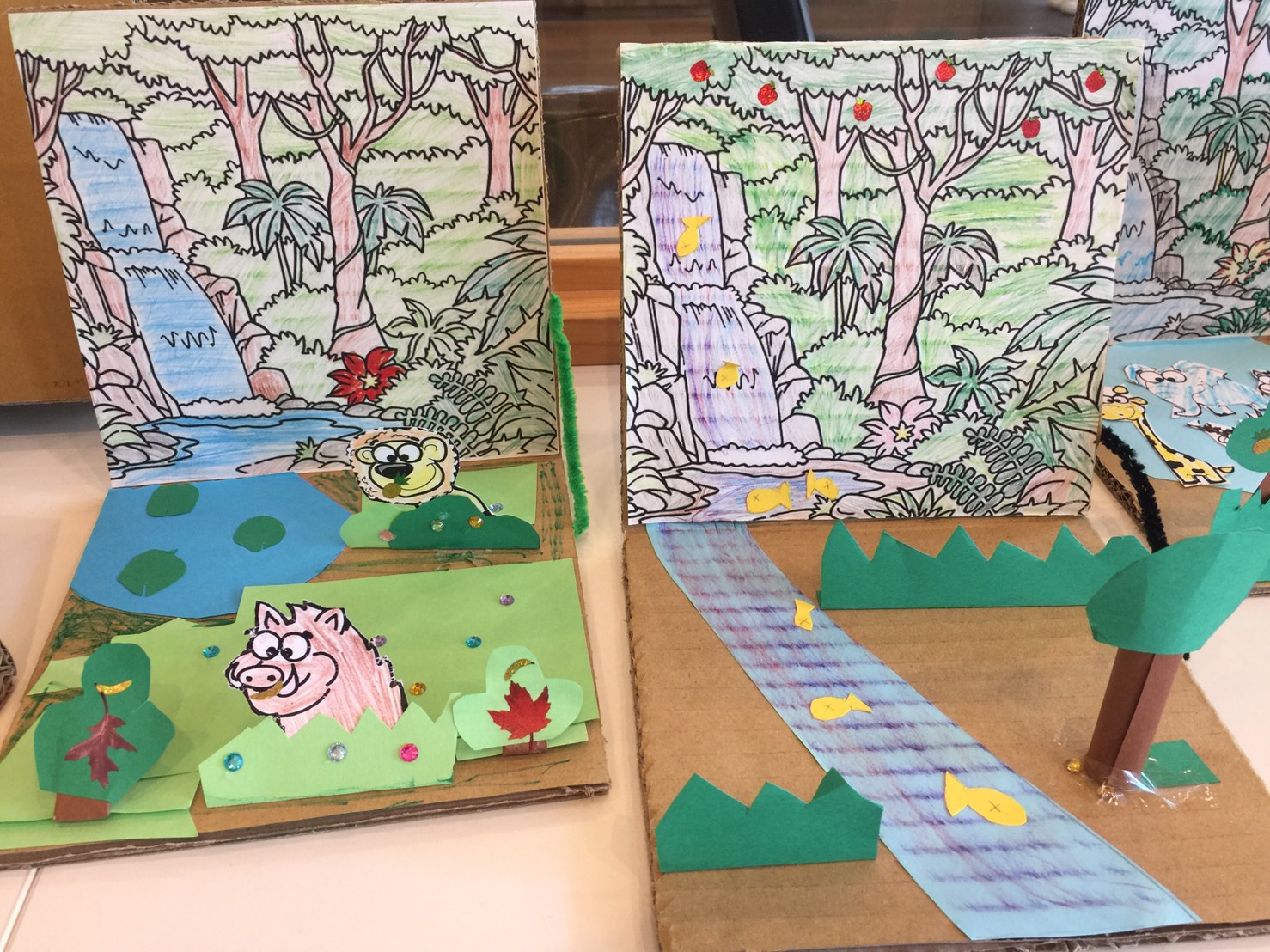 ジャングルの塗り絵を上の段ボールに貼り付けたら、好きなように色を塗りました。