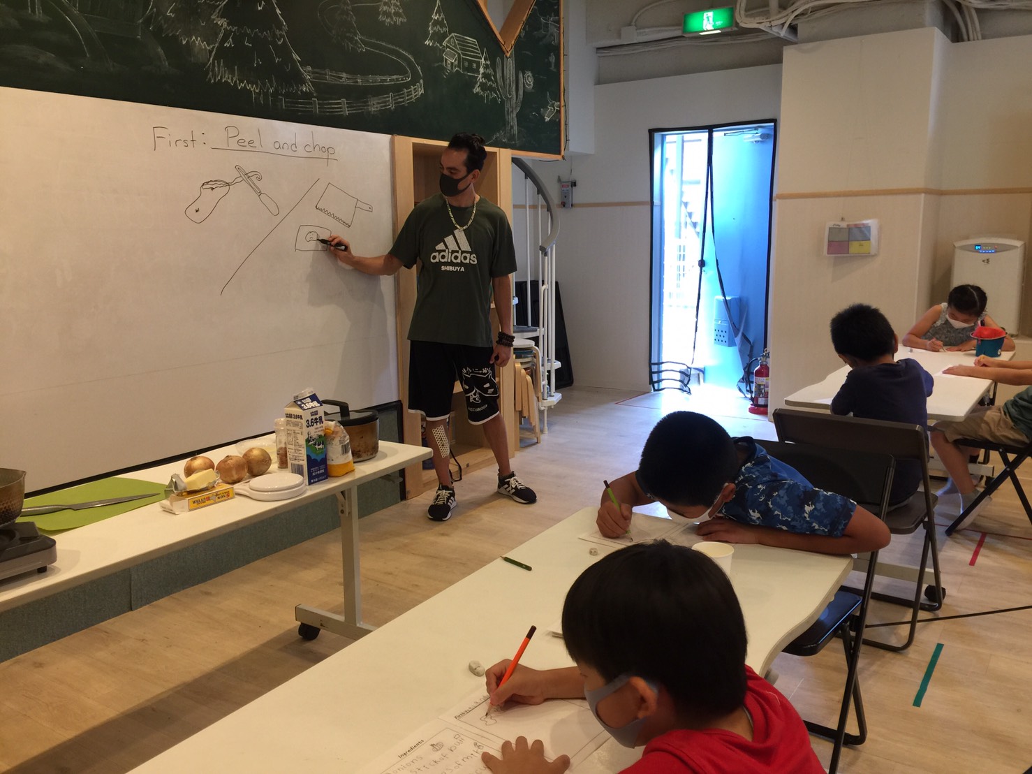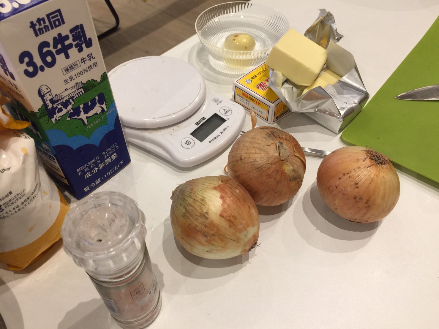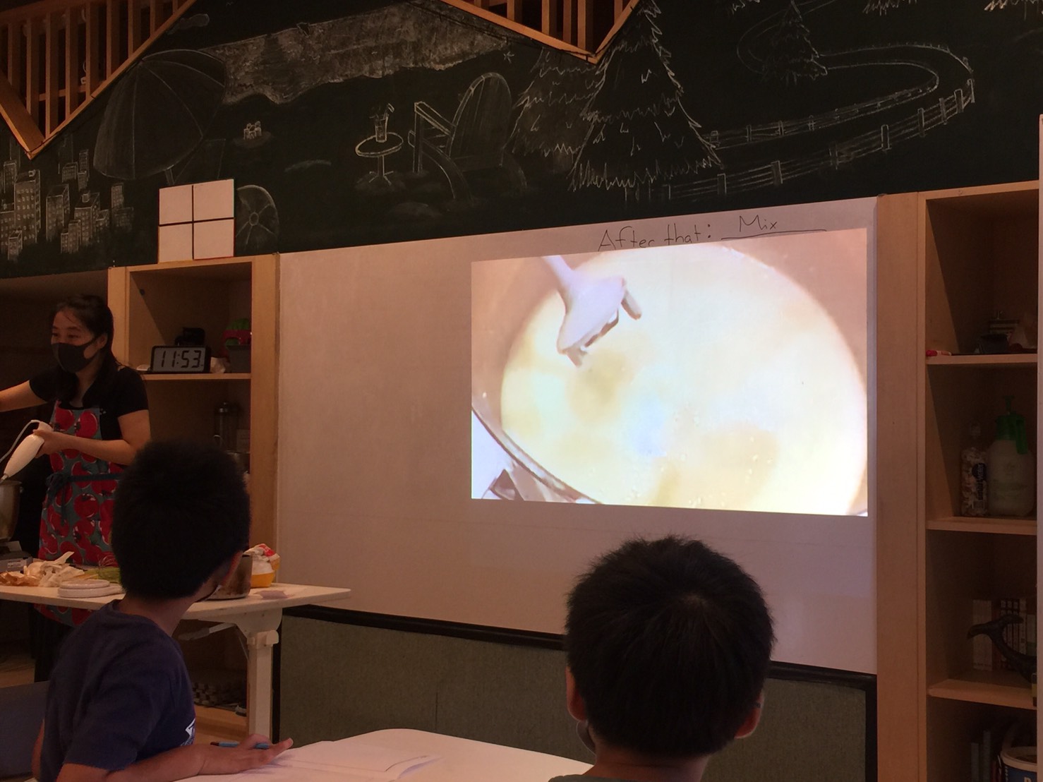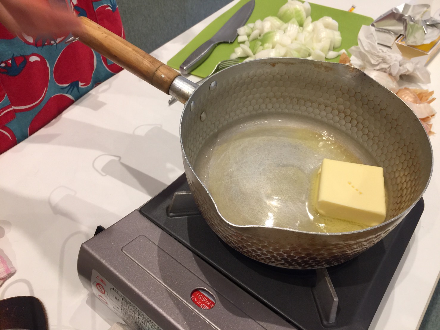 先生が前で実際にバターを溶かしたり、タマネギを切ったりして調理をしているのを確認しながら、会話をしながらみんなは自分たちのレシピを作りました。