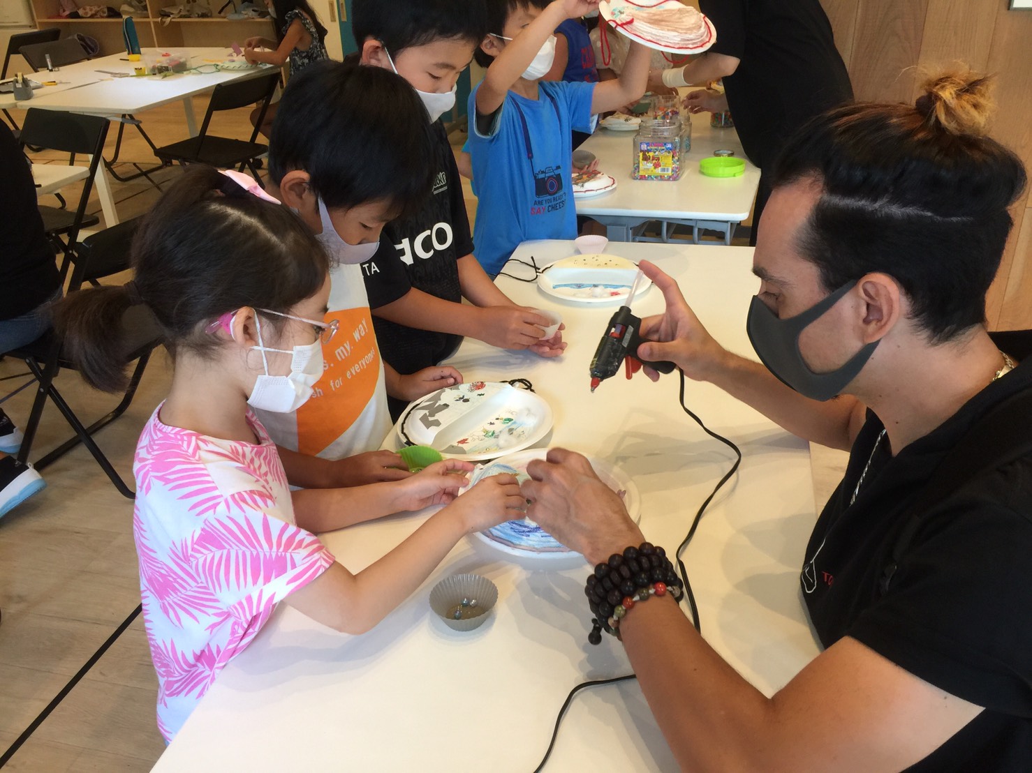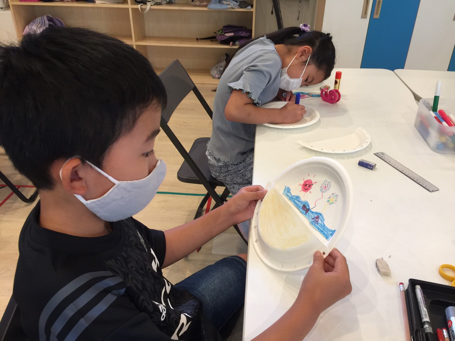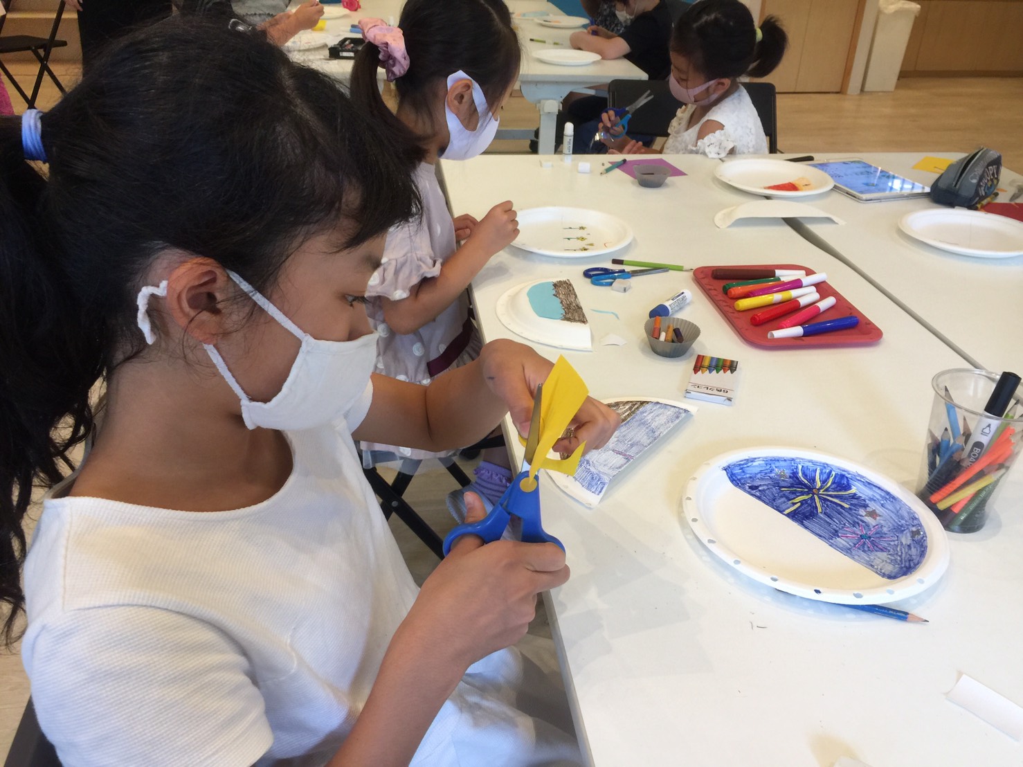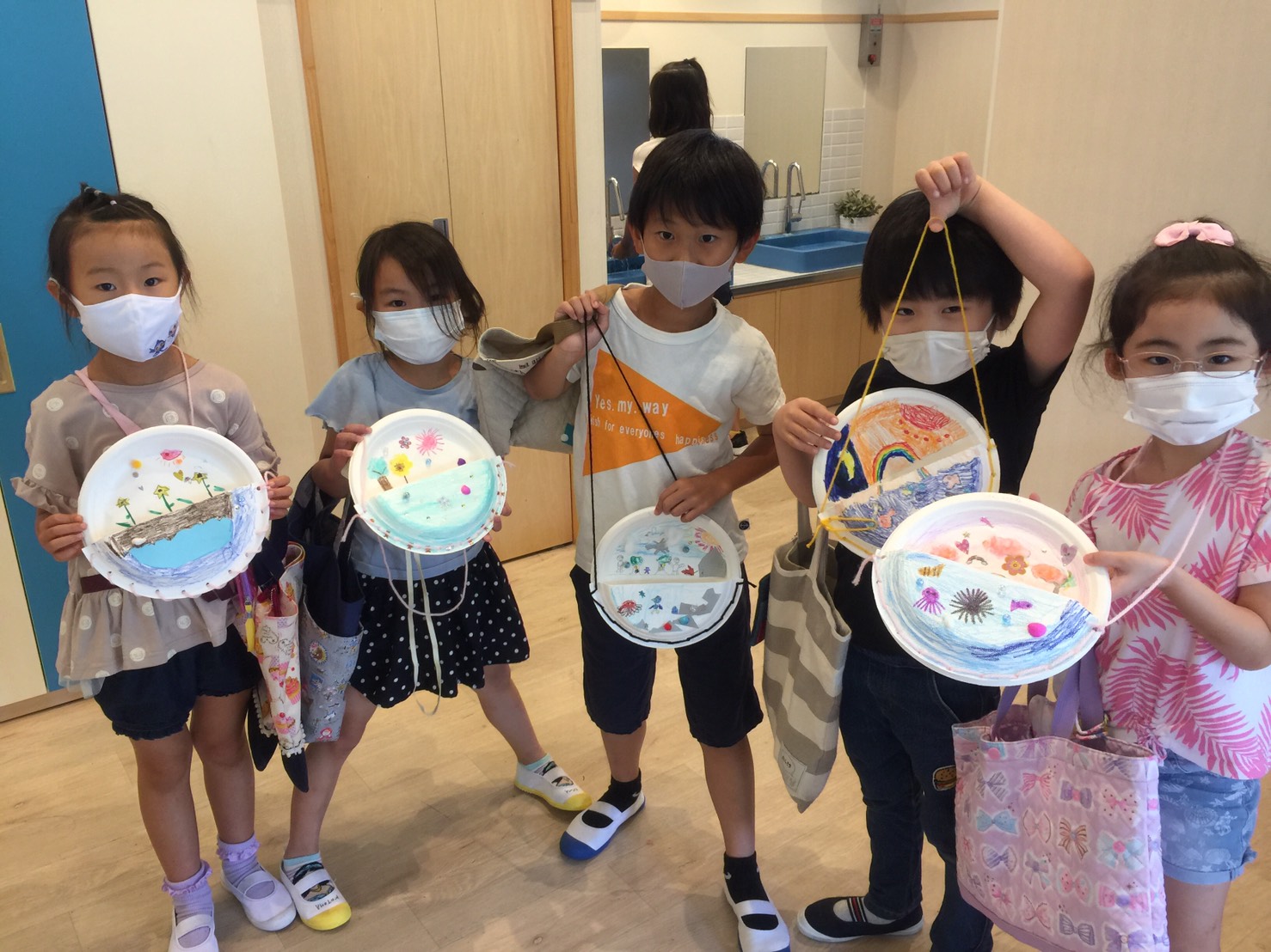 材料や夏に関する言葉をたくさん使ってコミュニケーションを取りながら、みんなとっても上手に工作ができました。
