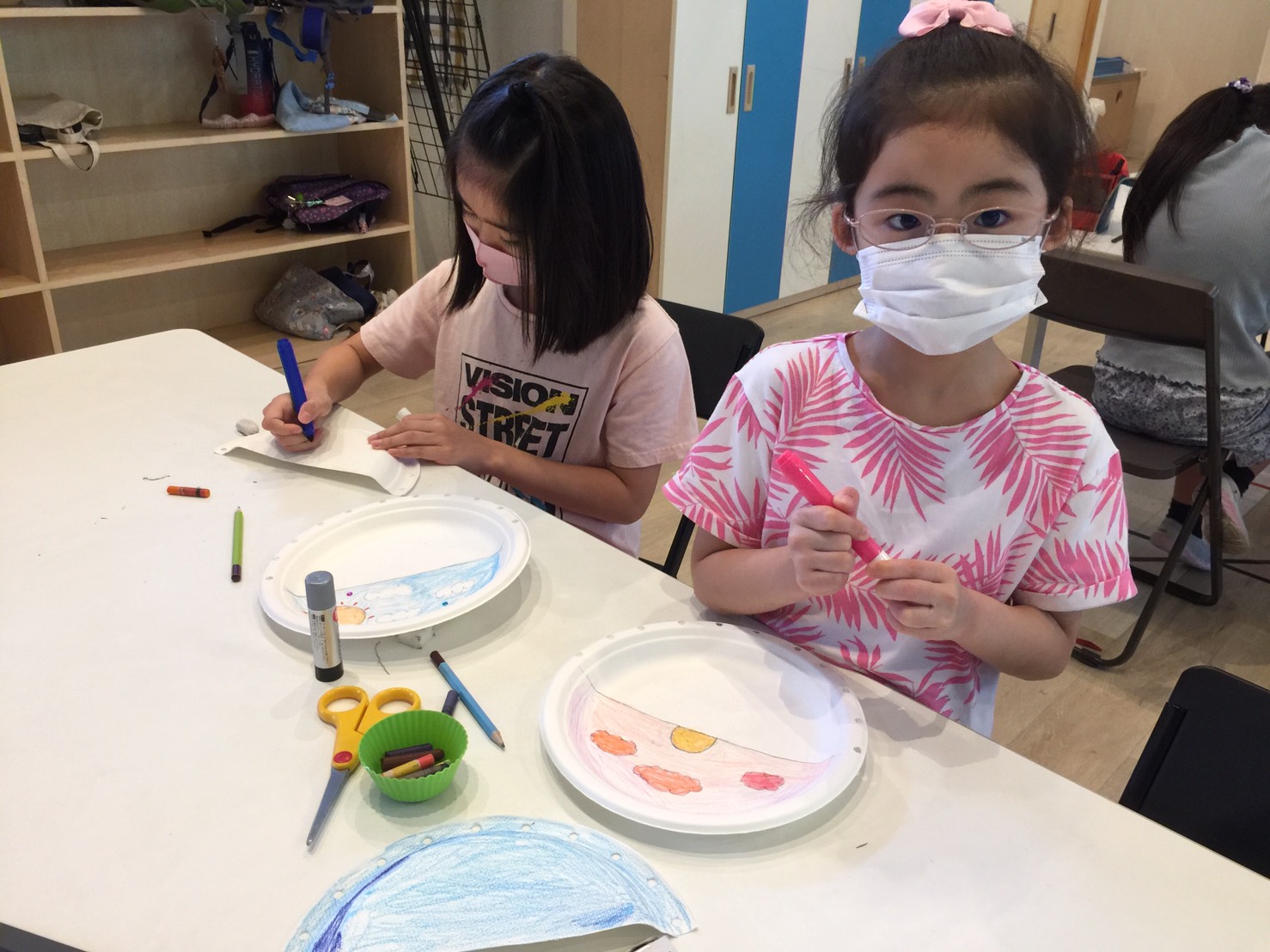 あらかじめ先生たちがバッグの形に切ったり、穴開けパンチで穴を開けてくれていた紙皿に絵を描いたり装飾をしてバッグを作りました。