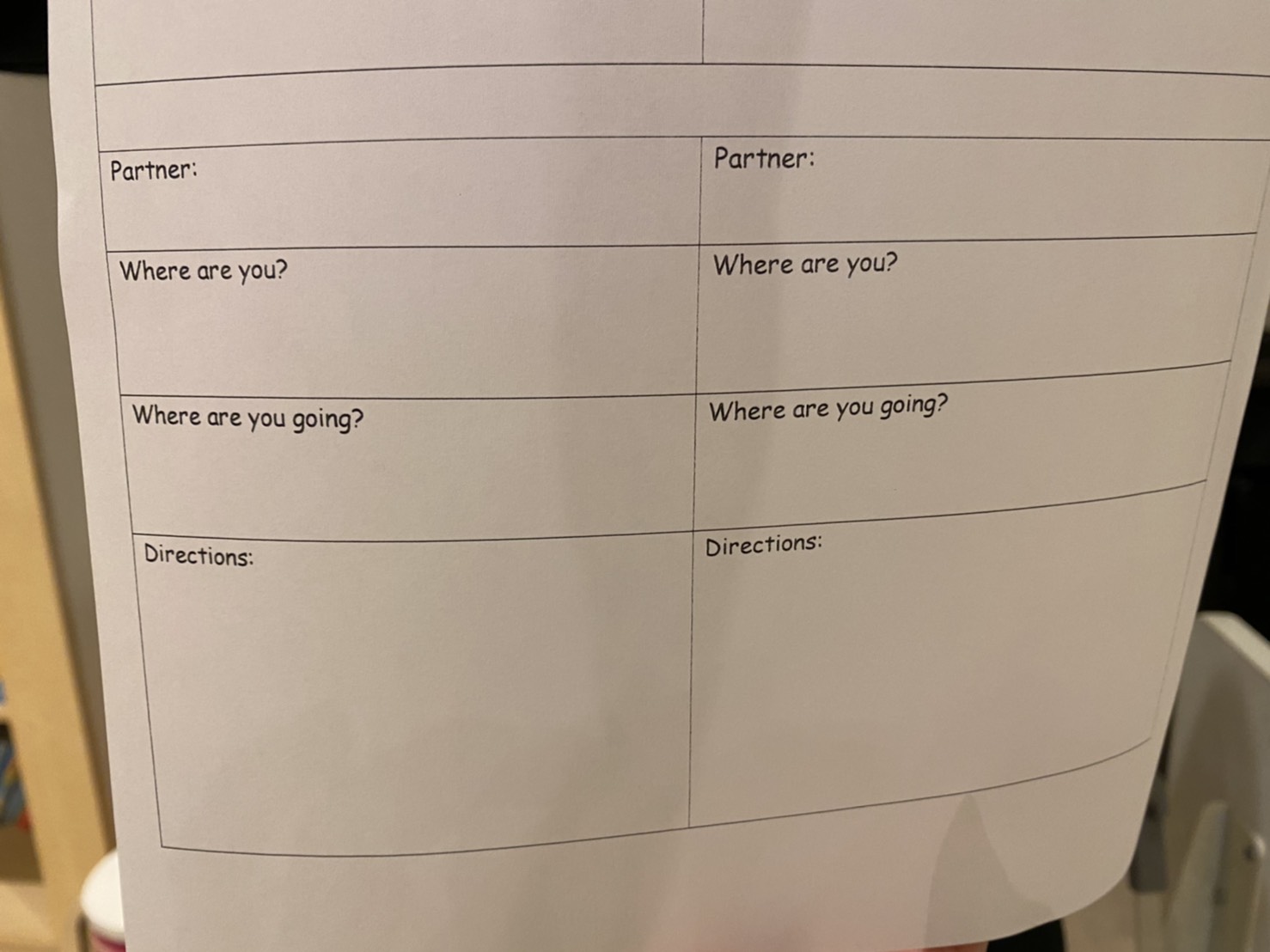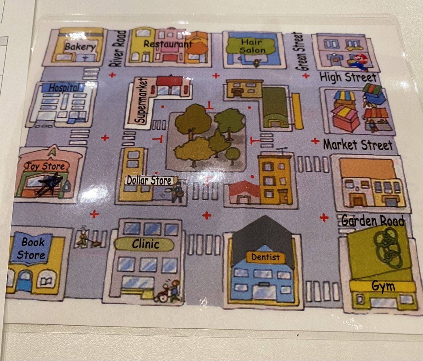 今日は地図とAt/ In/ Onを使って”Locations”(場所)の練習をしました