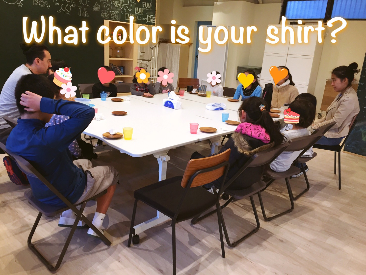 “My shirt is ______. What color is your shirt?”(私のシャツは〇色です。あなたのシャツは何色?)自分のシャツの色を答えてから、隣の人にも同じ質問を投げかけます。