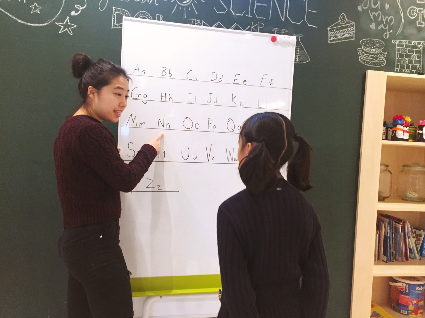 ホワイトボードに書かれている表を見ながら、先生と一緒にアルファベットの練習をしました。