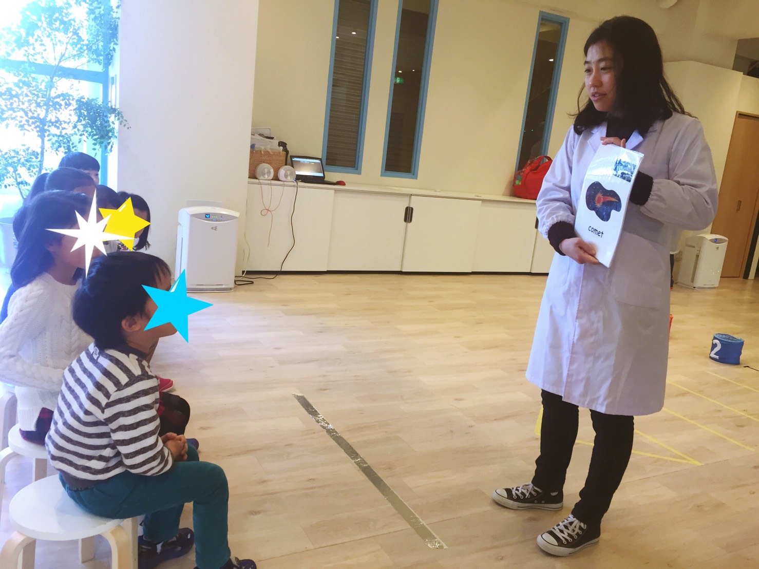 ご入会を検討されているお子さんと一緒にイベント(体験会)をやりました。既存生さん達も一緒に参加しながら普段のレッスンの雰囲気が感じられる様子で過ごしていただきます。今回のテーマは”Trip to Outer Space”(宇宙旅行)