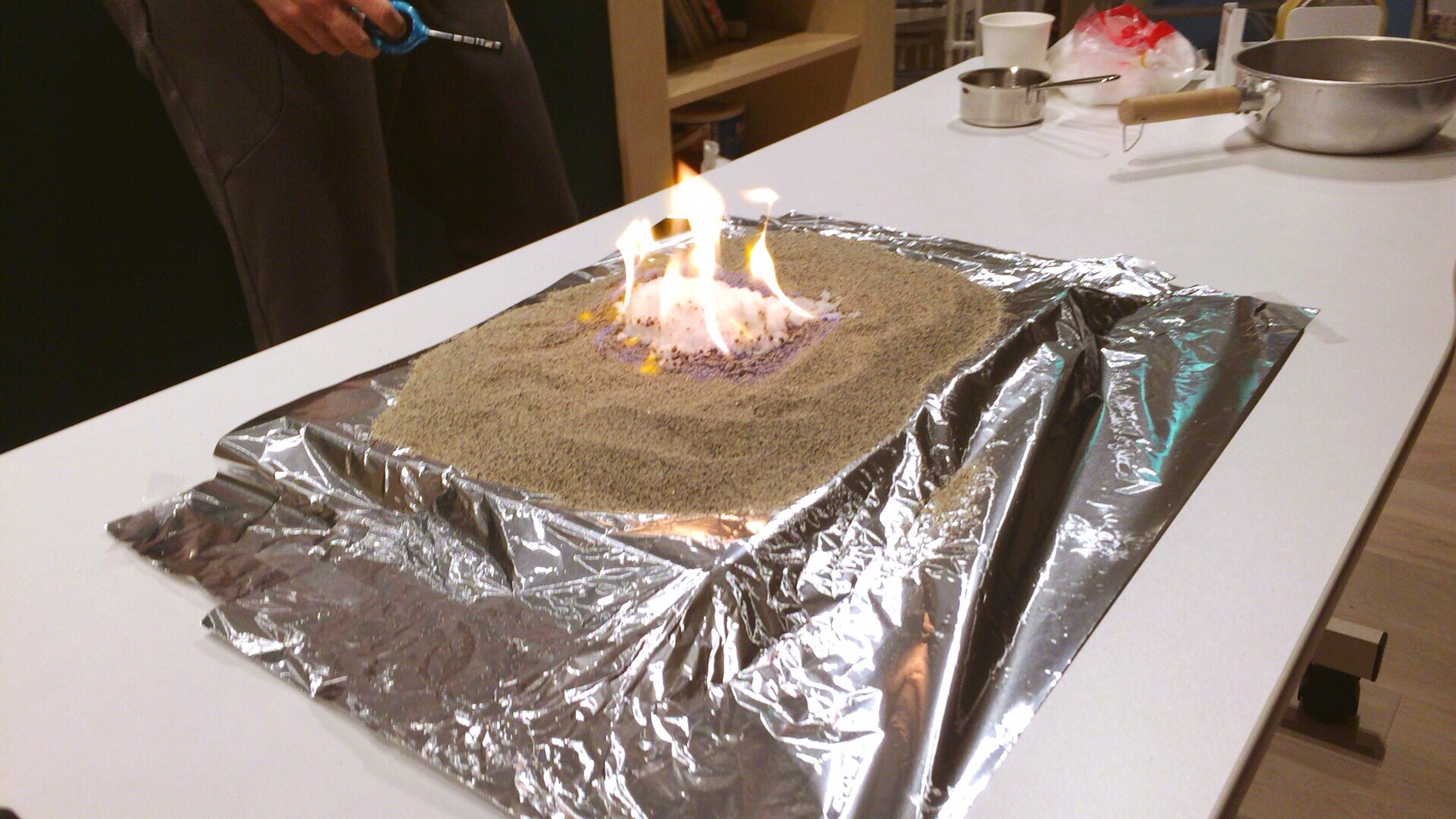 砂を鉄板の上に敷き詰め、十分なライター液を振りかけます。