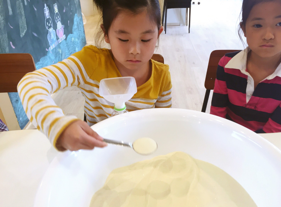 順番に”One scoop”(スプーン1杯)ずつ、カラフルな砂をボトルに入れて、とってもキレイな色の層ができあがりました!!