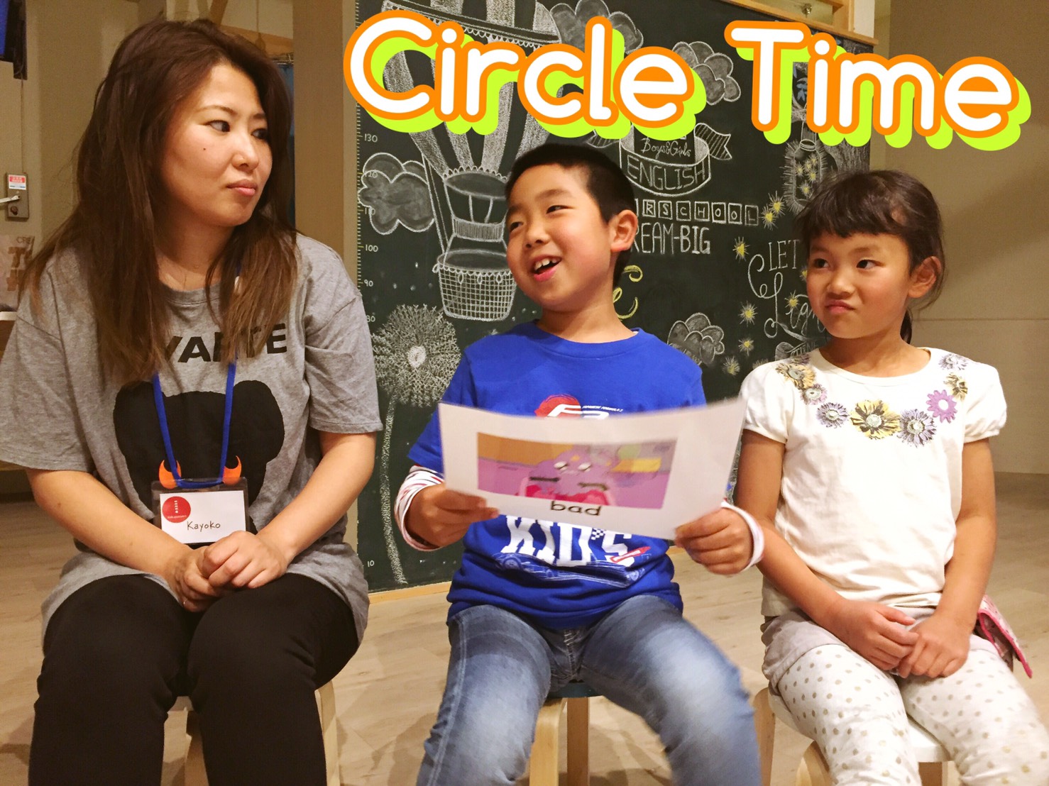 一日のレッスンの最後の時間は”Circle time”(サークルタイム)で締めくくります。みんなで輪になって座り、お題の単語を使って順番にセンテンスを作る練習をします。