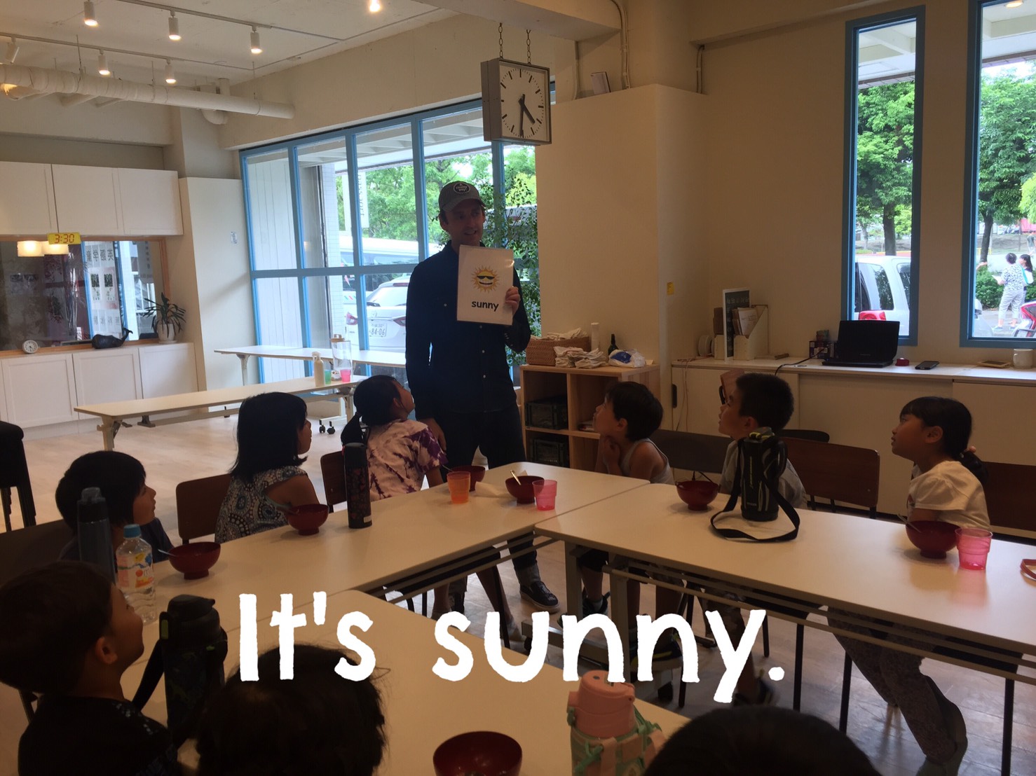 “It’s sunny. How’s the weather?”(晴れです。どんな天気?)