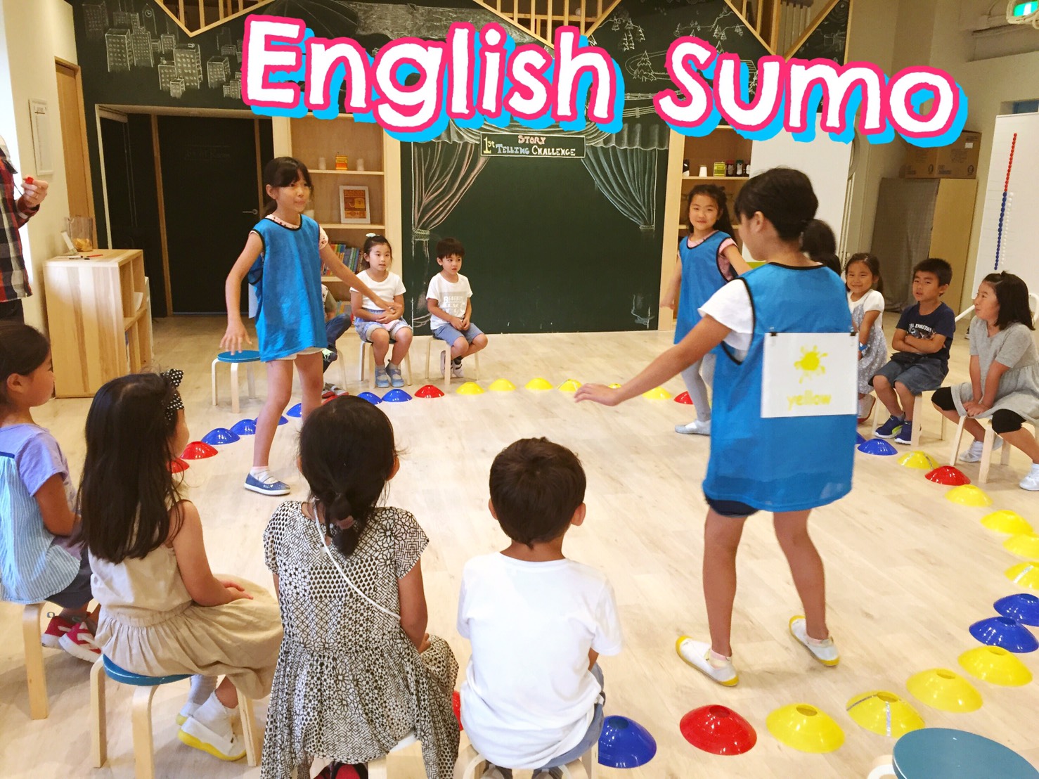 チーム対抗英語相撲!相手の背中に書いてあるフラッシュカードを当てたら勝ち!