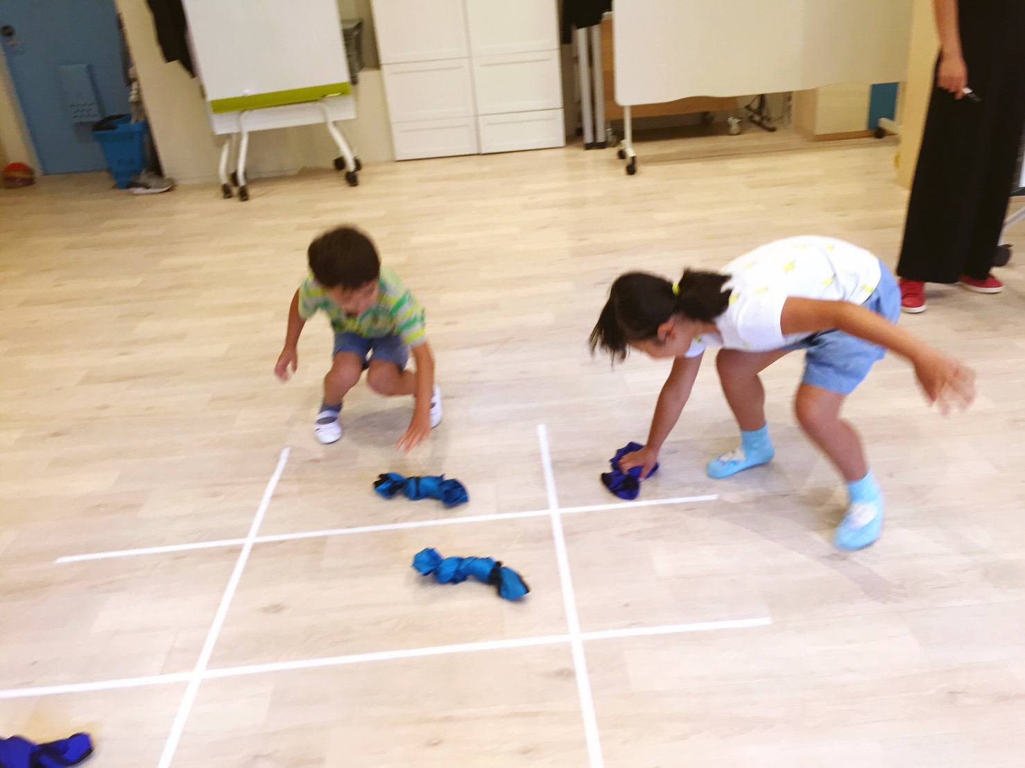 2チームに分かれて、ビブスで○×ゲーム(3マス1列に先に揃えたほうが勝ち)や