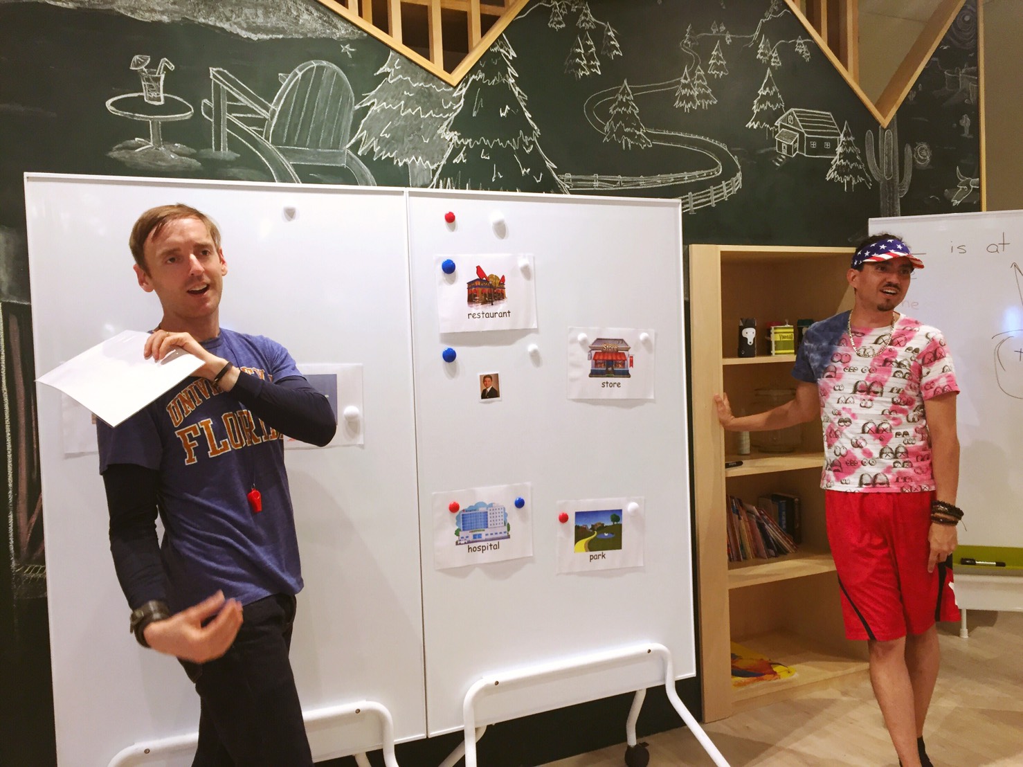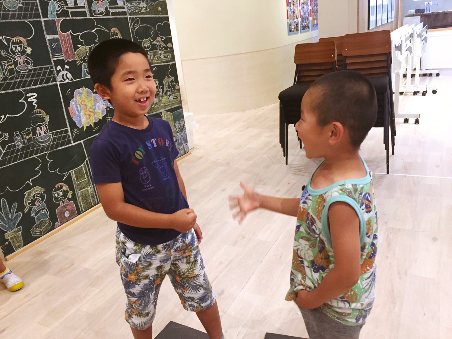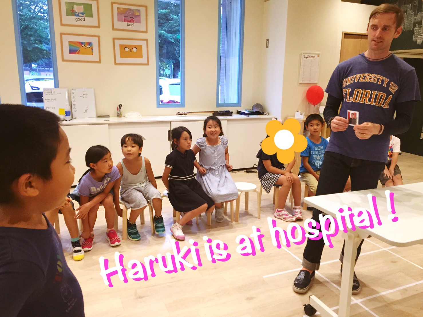 体験の生徒さんも混ざってもらいながら、ゲーム感覚で楽しんでみんな上手に”Where is ____?”(○○はどこにいる?)と”He/she is at (the) ____.”(彼/彼女は○○にいます)と言えていましたね。