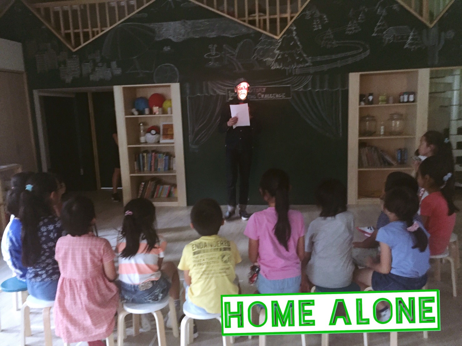 マイク先生が作ってくれた怖い話を、雷の音や点いたり消えたりする電気の演出と共に”Story time”(お話の時間)に披露してくれました。“Home alone”(家にひとり/留守番)