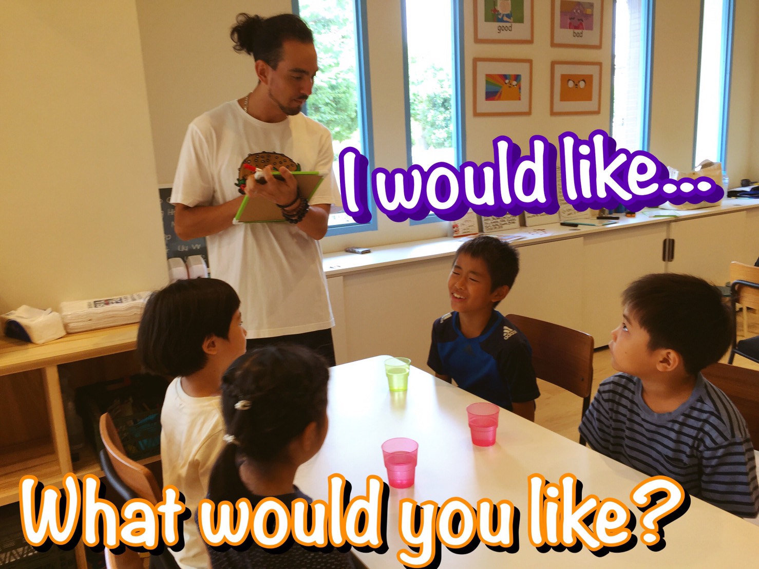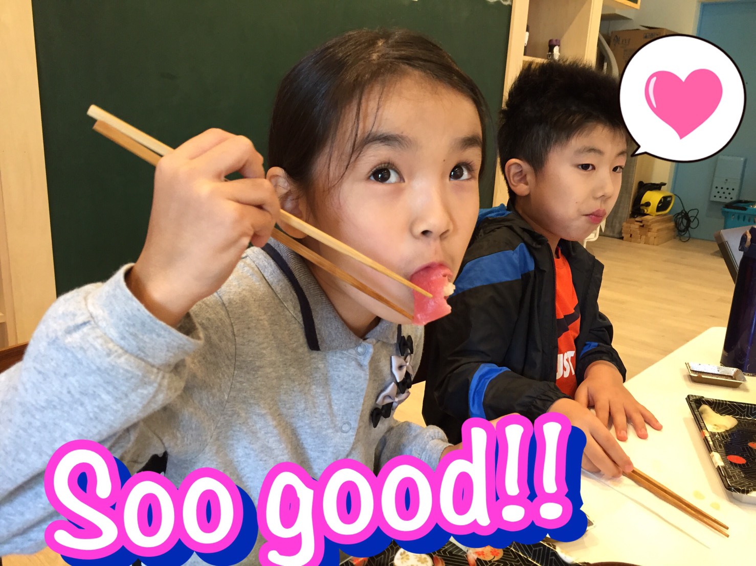 さぁ、いよいよお寿司の時間ですが、、、今日はレストランにいったときの想定をして入店〜のシミュレーションです。先生たちが店員さんとなって迎えます。先生:”Welcome to Smokey’s Sushi.”(スモーキー寿司店へようこそ)