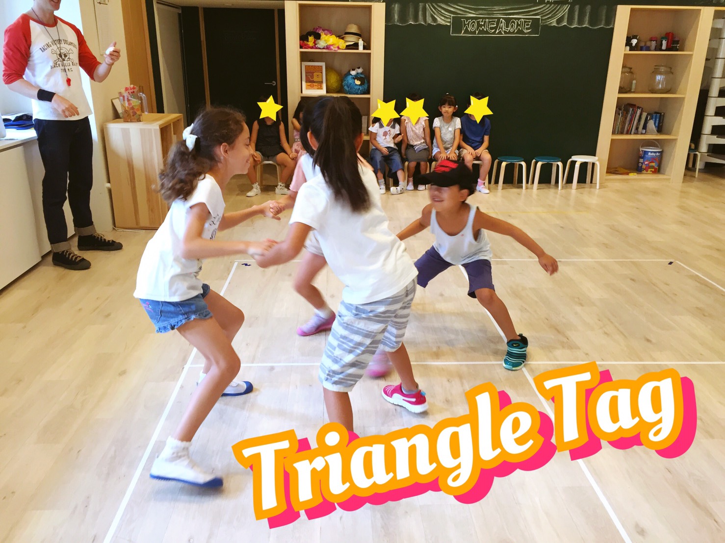 男の子チーム、女の子チームに分かれてトライアングル・タグ。名前を呼ばれた生徒さんが相手チームにタッチされないように、ブロックしてね!