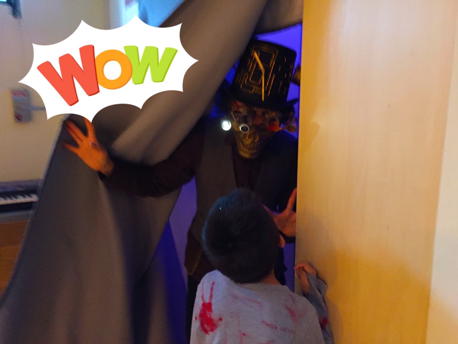 カーテンの向こうからは怖い音楽や叫び声が聞こえて来ます。