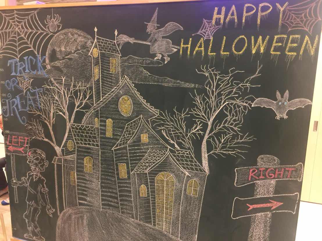 ハロウィンのお城が描かれている黒板、左(Left)、右(Right)、どちらか選んで進んでいこう。。。
