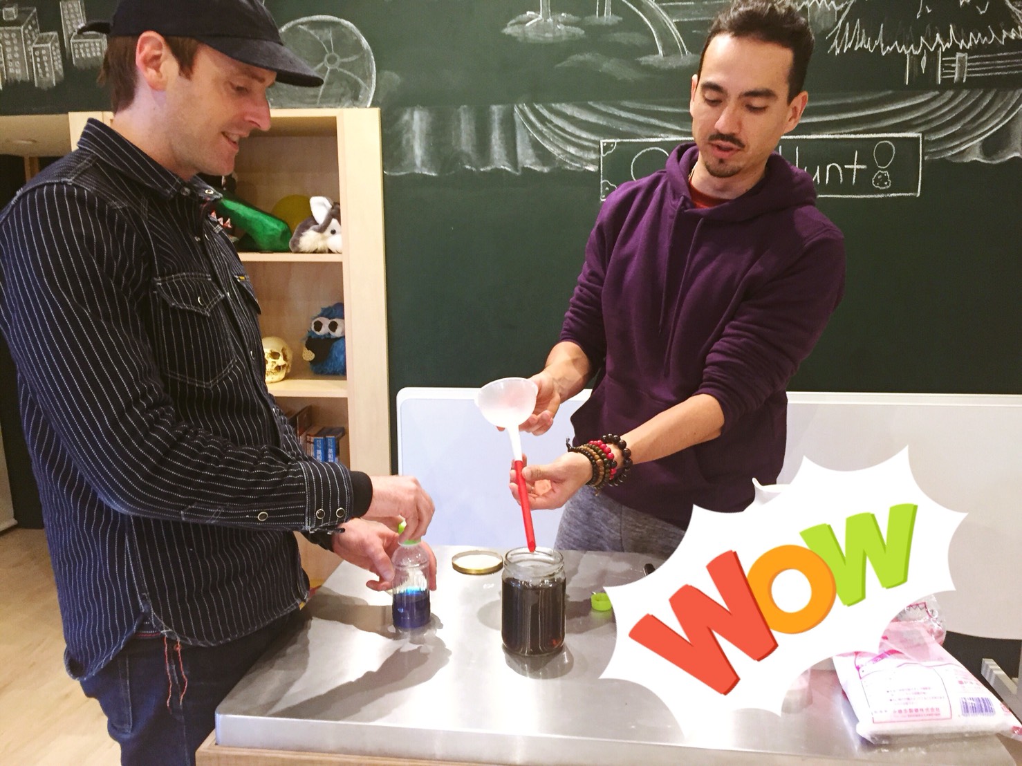 常温のお水でなく、なんと熱湯を使ってしまったので、生徒さん達の予想通りに混ざって黒色のお水(お湯)ができただけ・・・