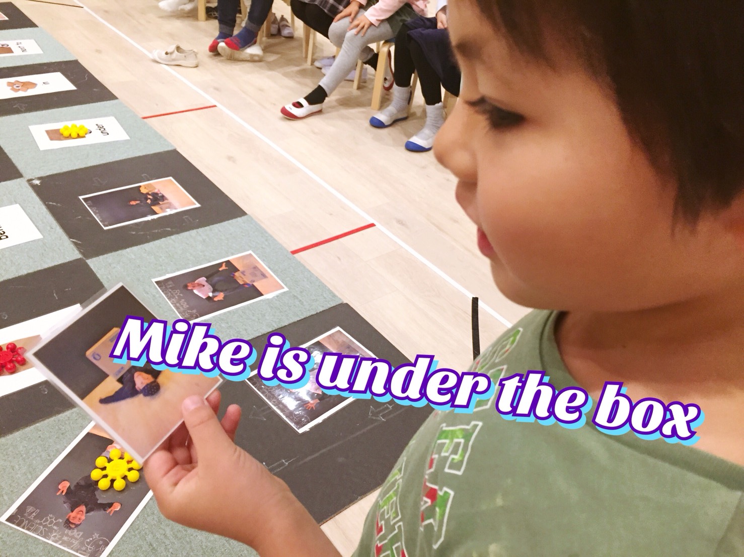 それではゲームスタート。カードや写真(例:マイク先生が箱の上に座っている写真)をみて、その写真の状態をセンテンスで答えるゲームです。