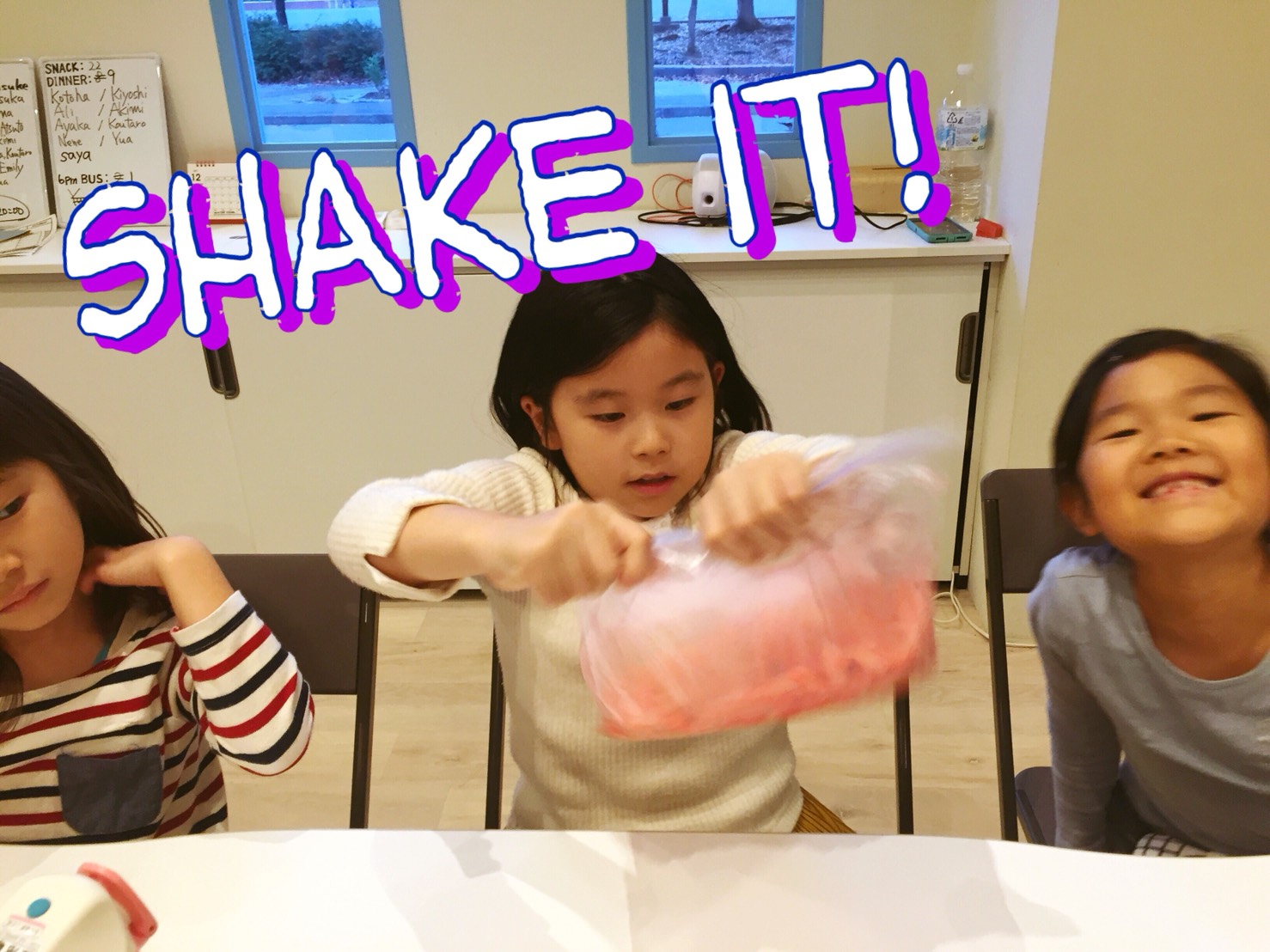 順番に5秒ずつ袋を”Shake, shake!”(振って、振って!)しました。