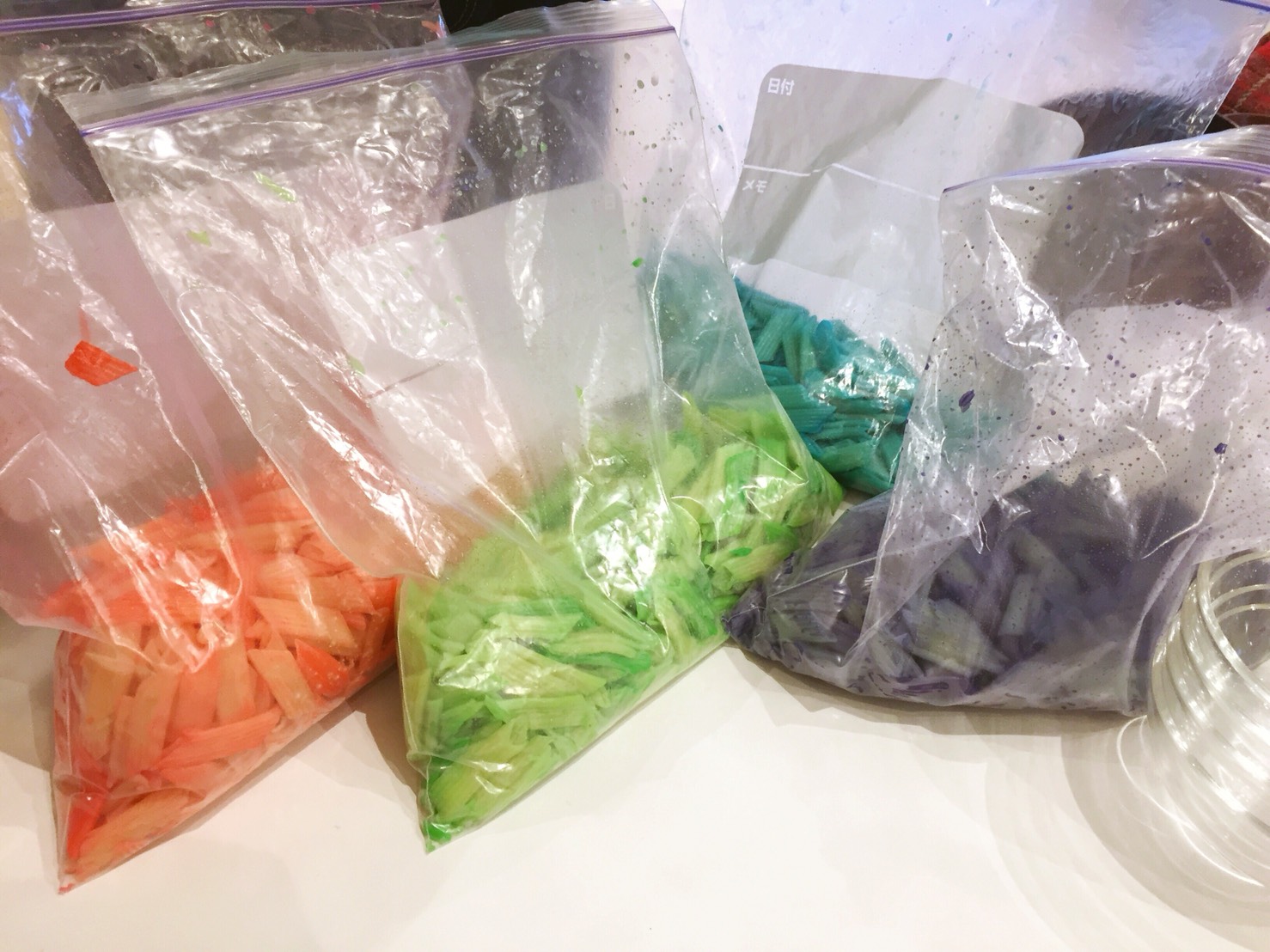 あらかじめ茹でてあるマカロニにピンク、青、緑、紫の”Food coloring”(食紅)で色をつけました。