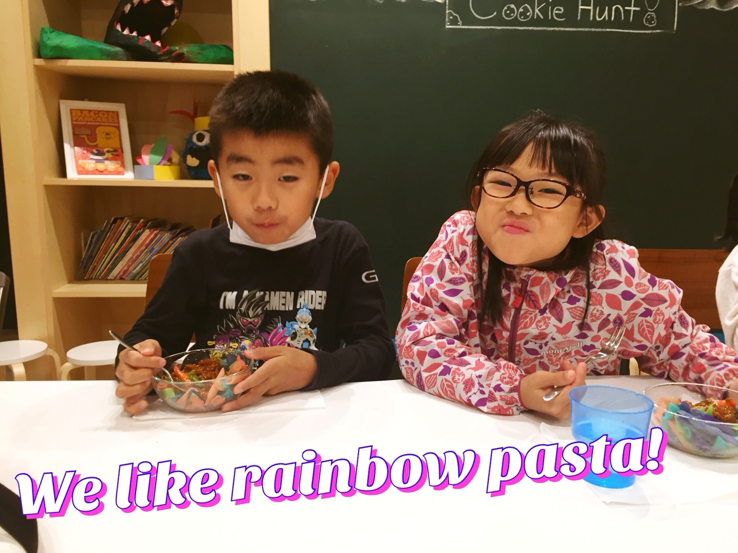 不思議そうな顔で”Pink pasta?”(ピンクのパスタ?)と先生を見ていました。