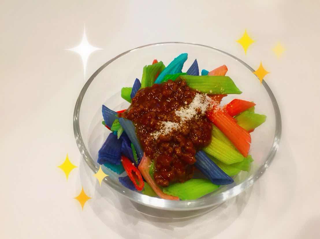 とってもキレイなカラフルパスタにミートソースと粉チーズを乗せて、美味しくいただきました!