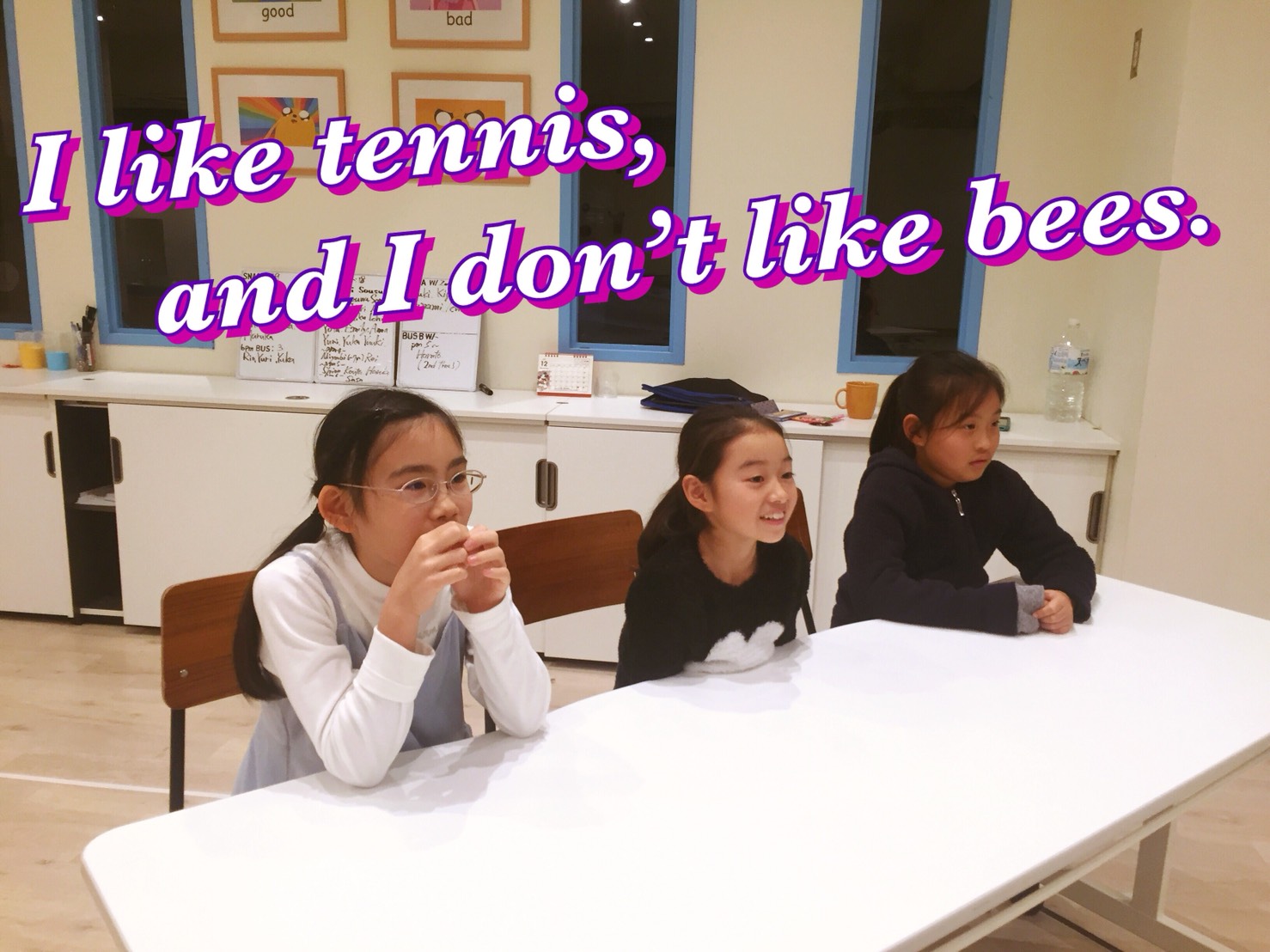 自分たちで主語と目的語を考えて、“Like/likes”(好き)“Don’t like/doesn’t like”(好きじゃない)“Hate/hates”(嫌い)と組み合わせていろいろなセンテンスを作って発表しました。