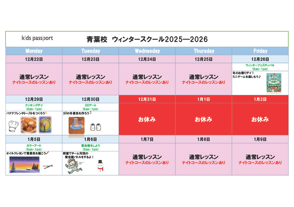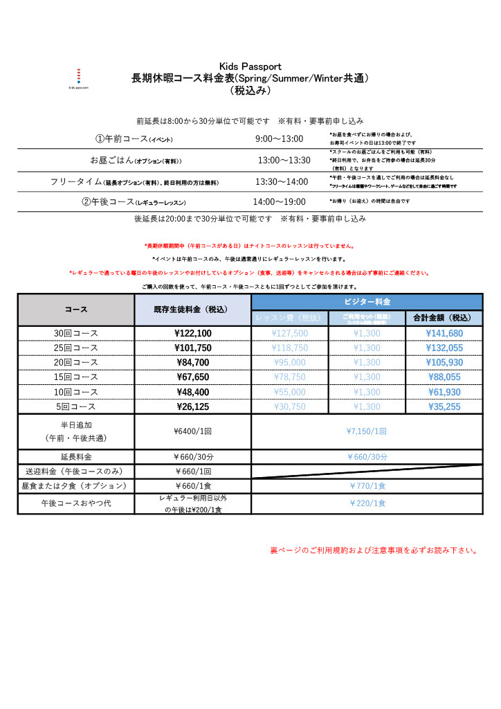 - 長期休暇期間中はナイトコースのレッスンはおこなっていません。